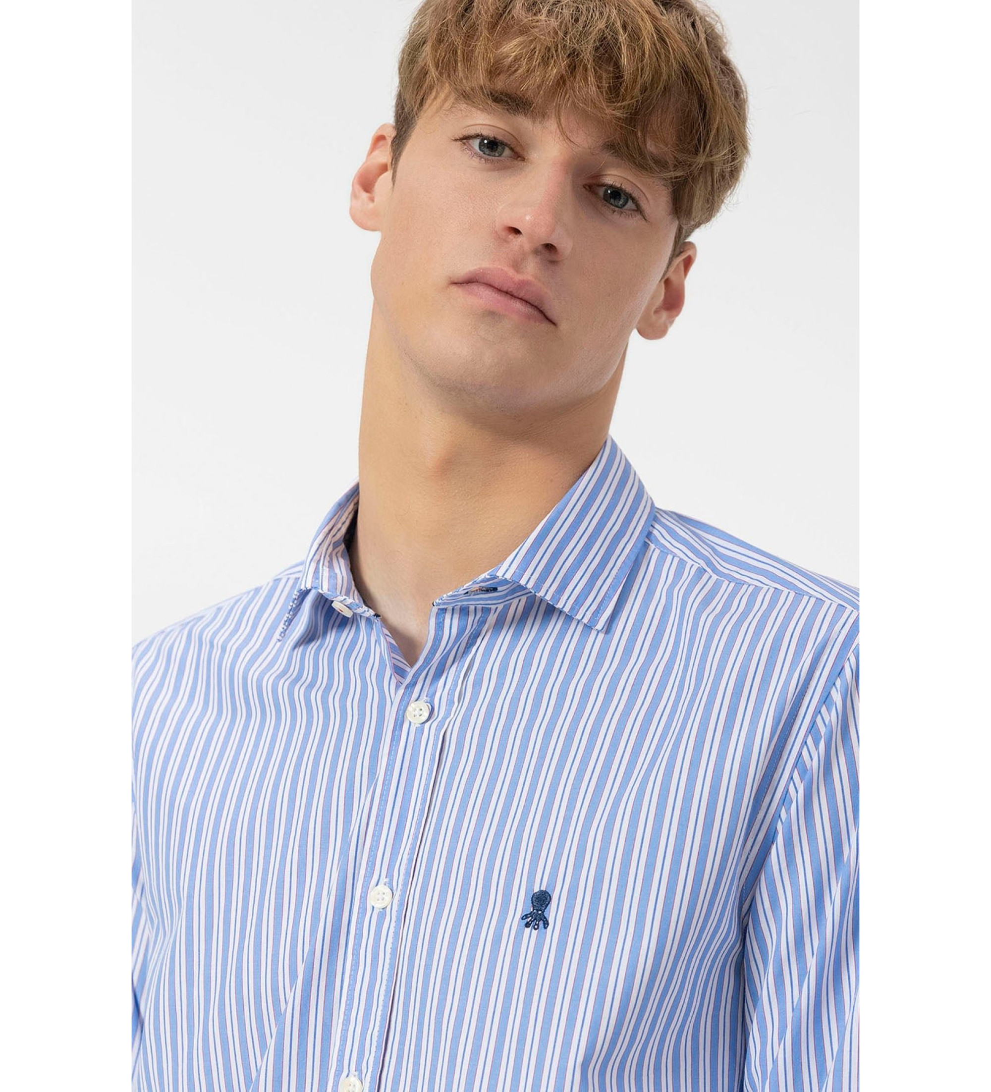 Camicia a maniche lunghe del marchio Pulpo con stampa a righe blu. Un design elegante e moderno, ideale per look formali o casual con un tocco di stile.