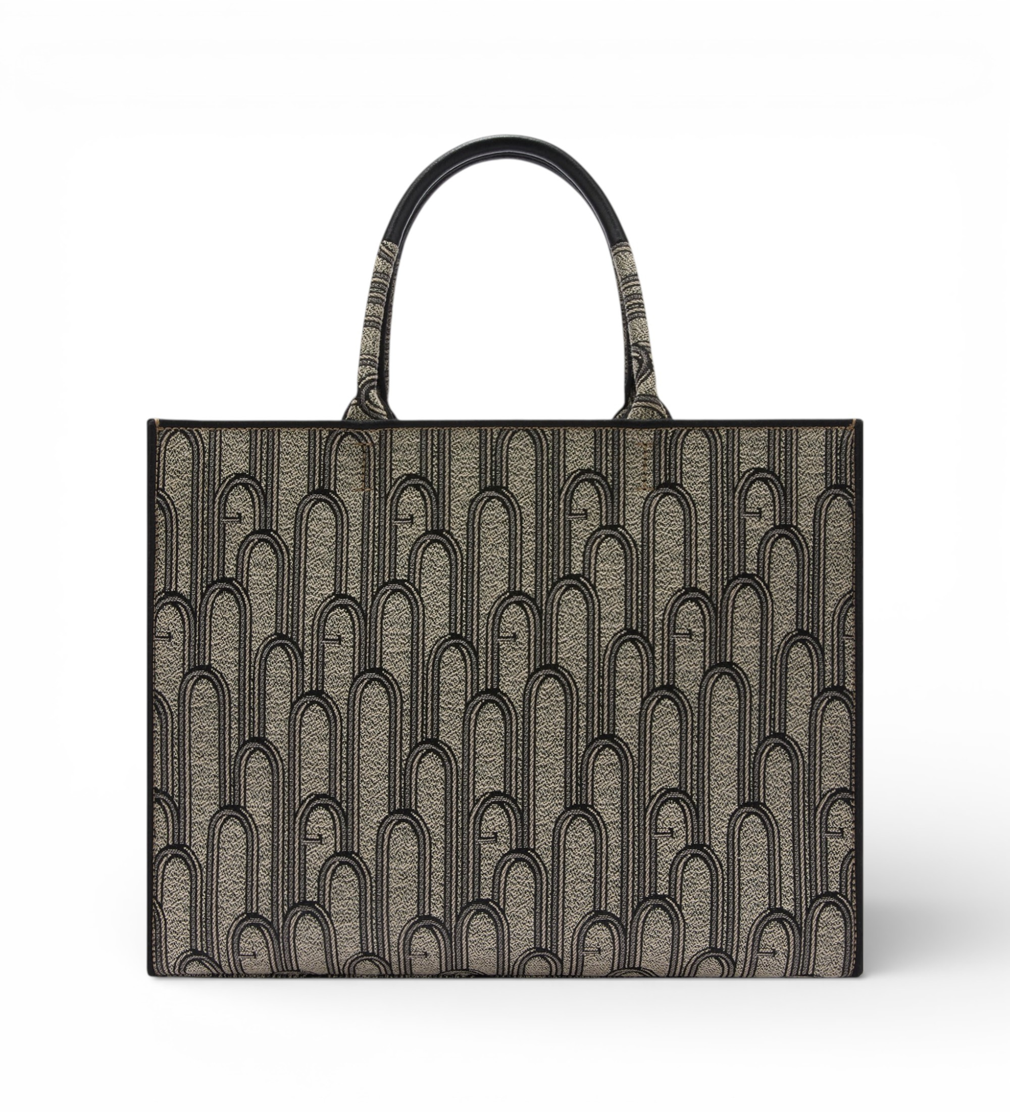 La borsa tote Furla in jacquard con motivo ad arco nero e beige è un pezzo artistico e sofisticato che trasforma un accessorio funzionale in un elemento di stile. Il suo motivo geometrico di ispirazione architettonica e la sua capienza generosa la rendono la compagna perfetta per la donna moderna che vuole distinguersi.