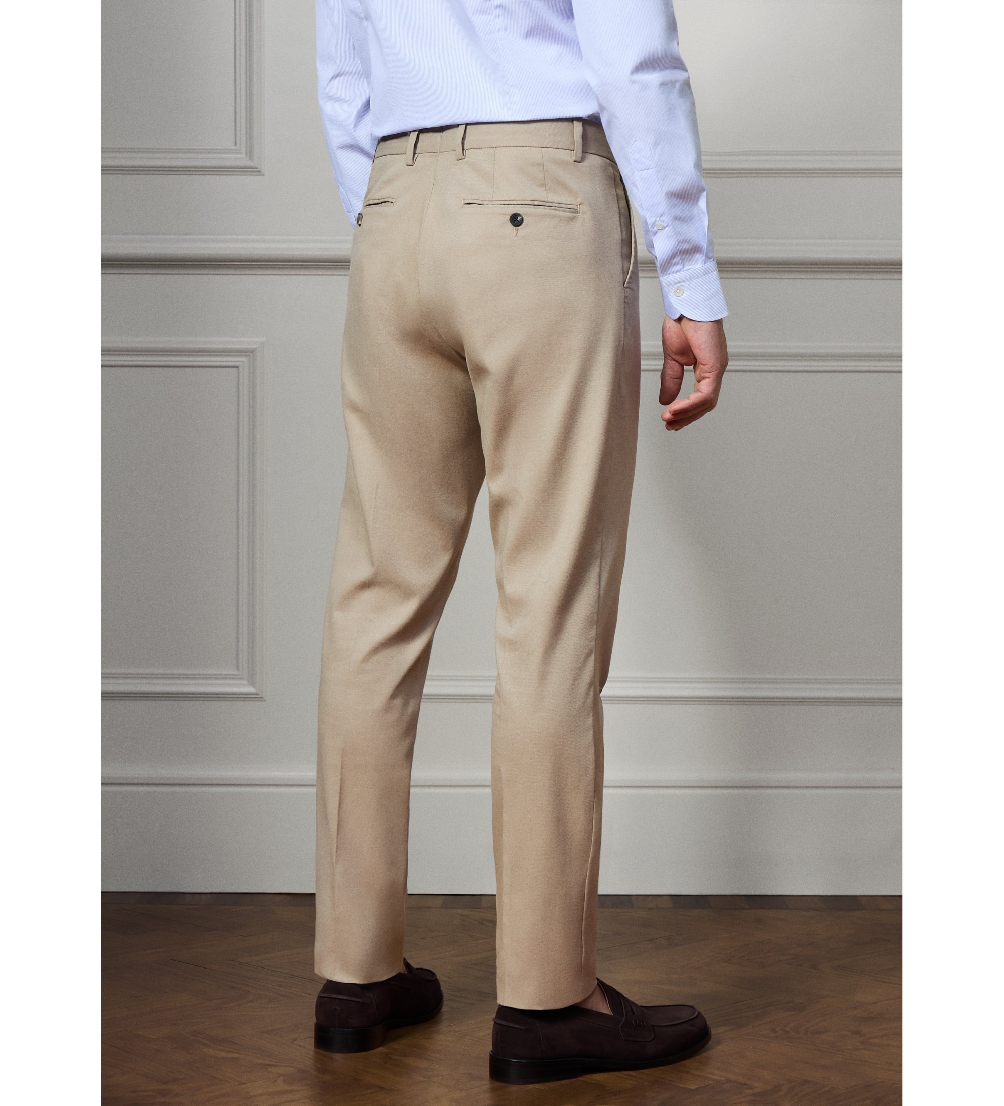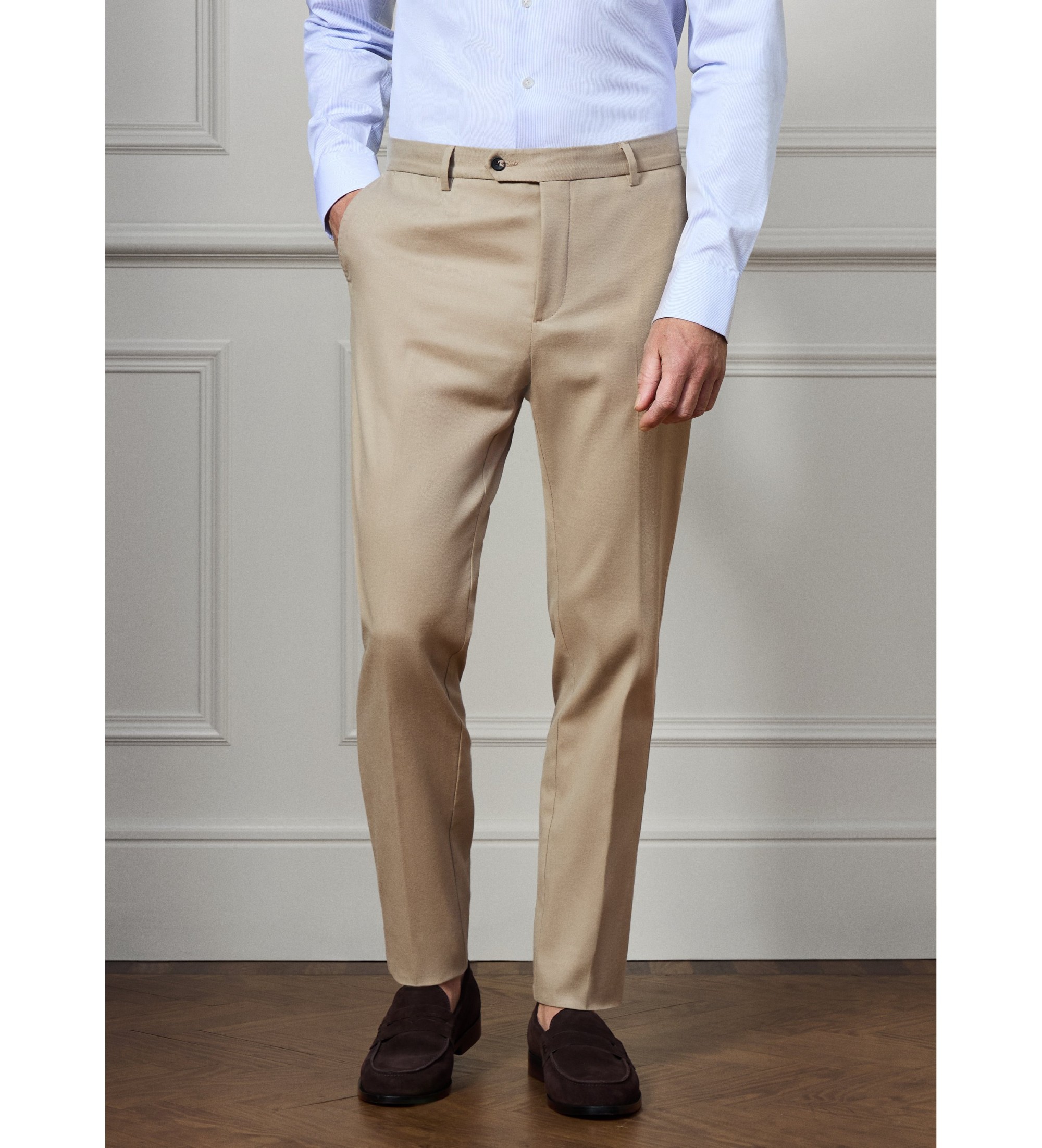 Pantaloni eleganti in una tonalit beige pietra, realizzati in tessuto liscio e caratterizzati da un'elegante vestibilit slim. Un capo sartoriale raffinato e senza tempo che unisce l'eleganza di una vestibilit slim alla versatilit di un colore neutro, ideale per look formali di alto livello e smart casual.