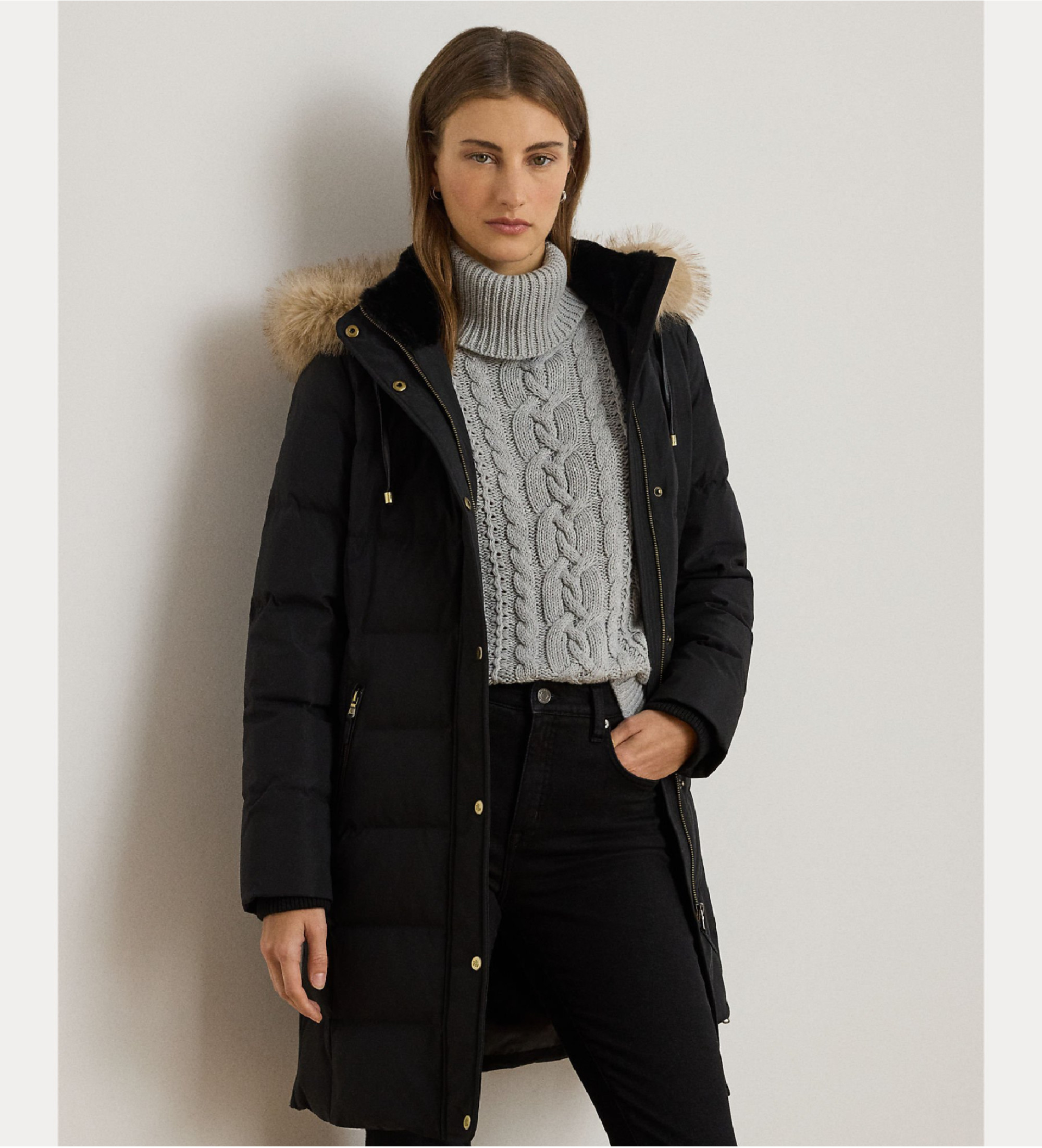 Con uno stile che unisce eleganza e praticit, questo cappotto trapuntato presenta un cappuccio staccabile con bordo in pelliccia sintetica, un tessuto esterno resistente all'acqua e un'imbottitura in soffice piumino 450 per mantenerti asciutto e caldo. Le cuciture a principessa anteriori e posteriori ne esaltano la silhouette aerodinamica, mentre i bottoni automatici in metallo incisi con le iniziali "LRL" aggiungono un tocco distintivo.
