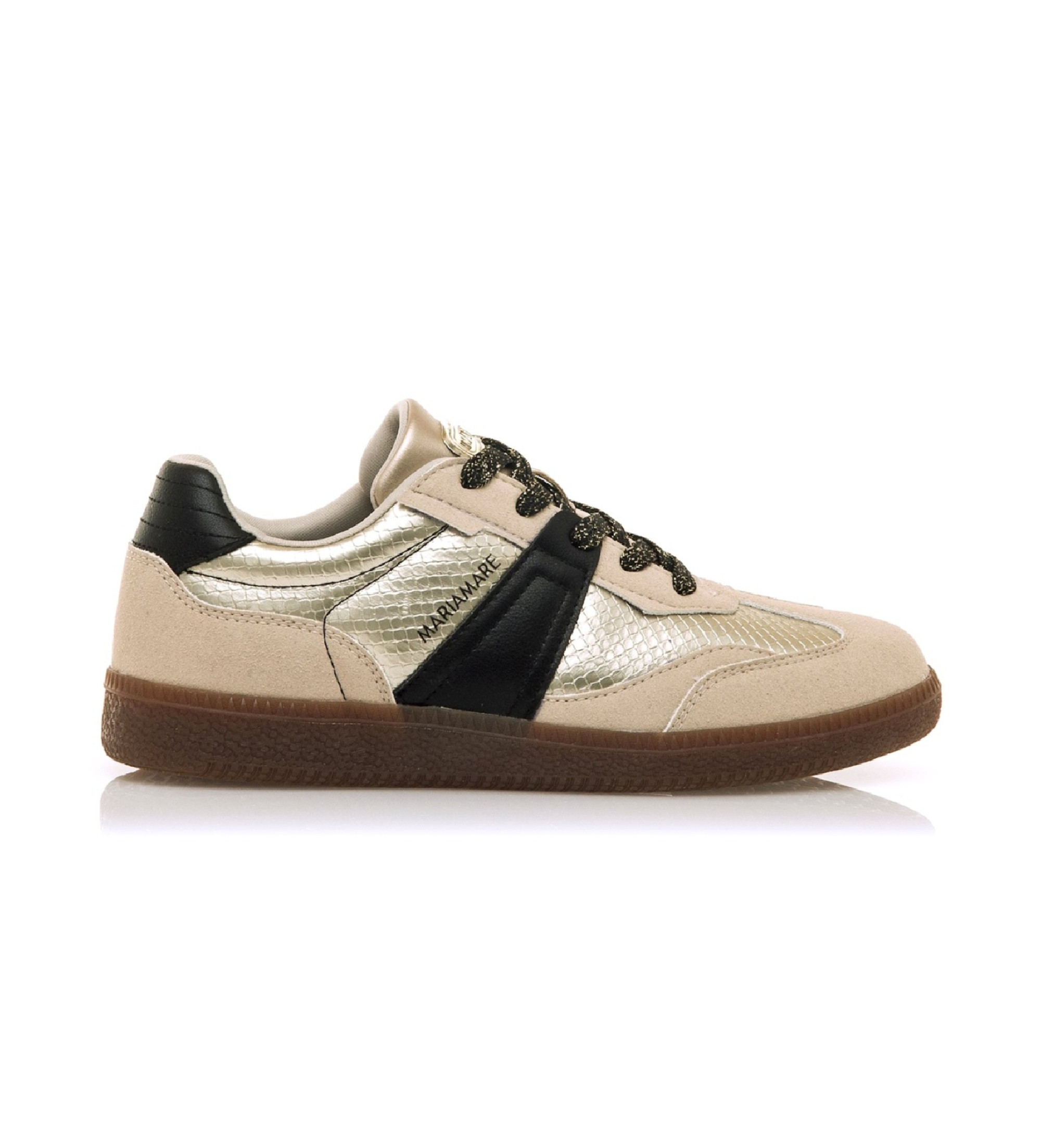 Sneakers da donna Fiora color sabbia di Mariamare, dal design sportivo e retrò. Queste sneakers presentano inserti metallici con texture effetto serpente in un'elegante tonalità champagne. A contrasto, risaltano il lato e il tallone neri, insieme ai lacci che incorporano un filo lucido per un tocco distintivo. La suola in gomma color caramello e la punta rinforzata garantiscono comfort e funzionalità per l'uso quotidiano. Sono ideali per chi cerca un equilibrio tra stile e praticità.