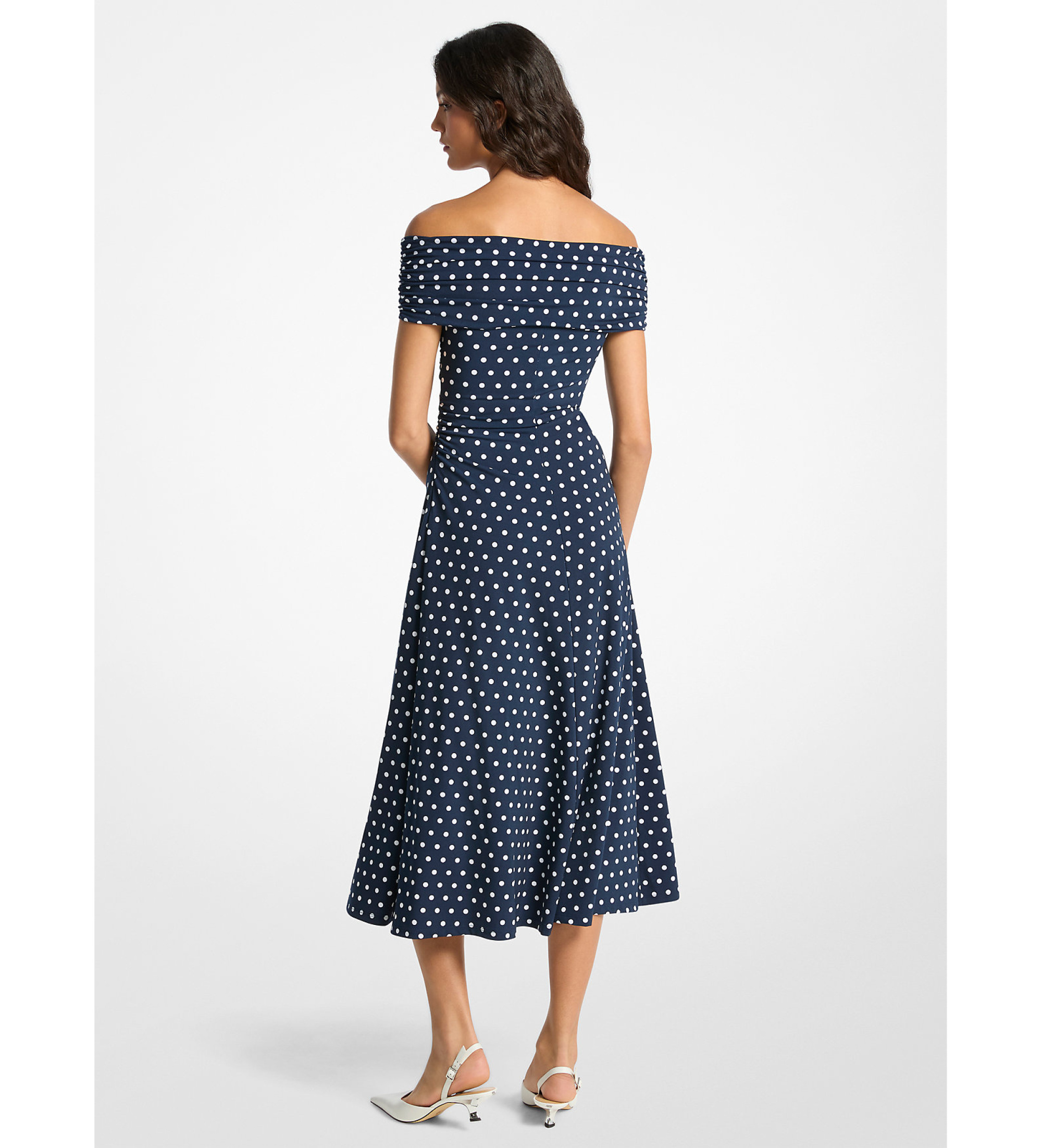 Con un tocco femminile e un fascino retr, questo abito a pois si distingue per lo scollo incrociato che accentua delicatamente le spalle. Il corpetto aderente valorizza la figura e crea un bellissimo contrasto con l'elegante drappeggio della gonna midi. Completa il look con dei tacchi e un audace rossetto rosso per uno stile glamour e senza tempo.