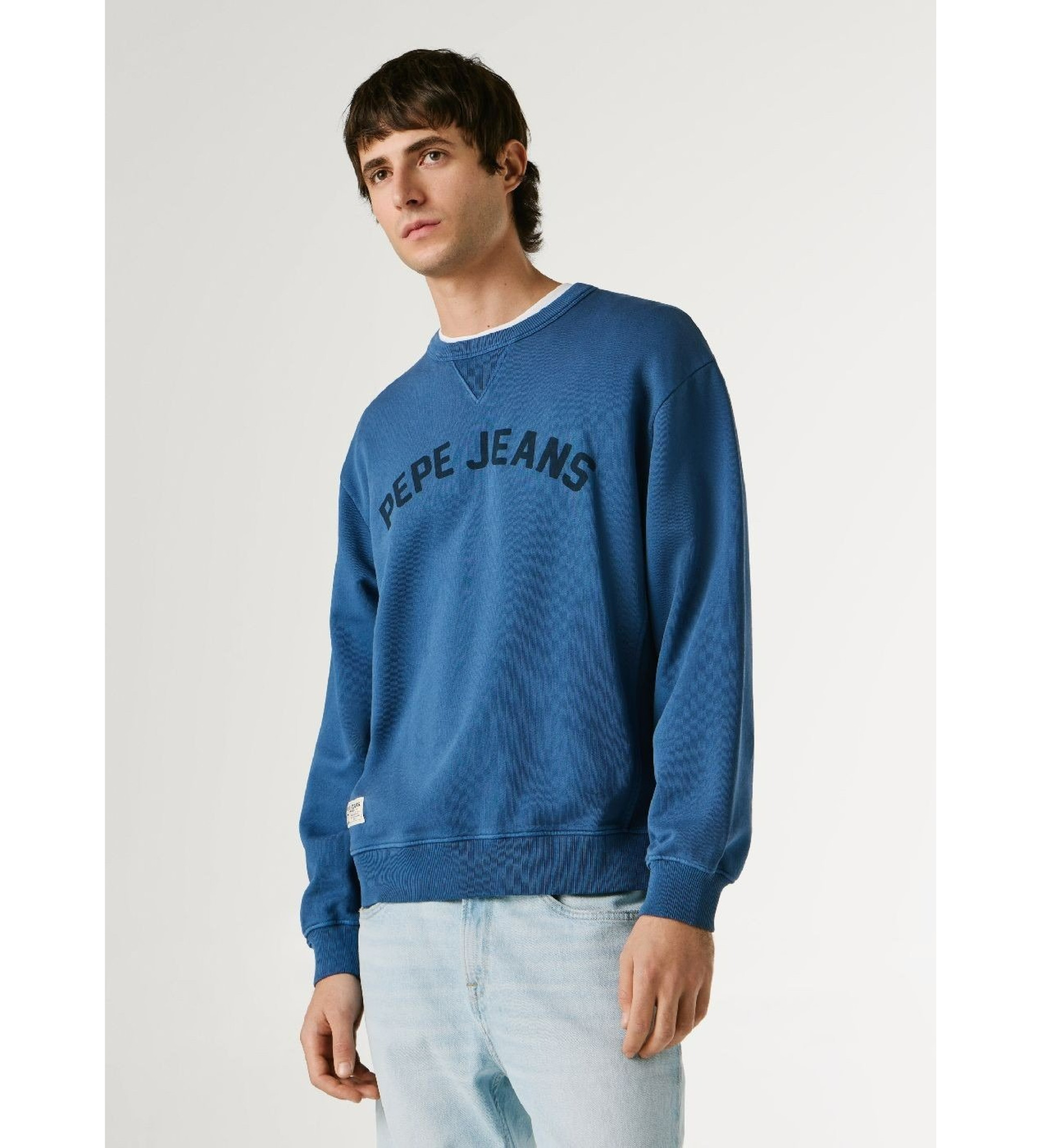 Felpa girocollo in tessuto a maglia con grande stampa al centro del petto, inserti a costine sui lati e sotto le ascelle, scollo a V, bordi a costine sulla tasca a marsupio ed etichetta con il marchio sull'orlo. Finitura tinta in capo/lavata.
