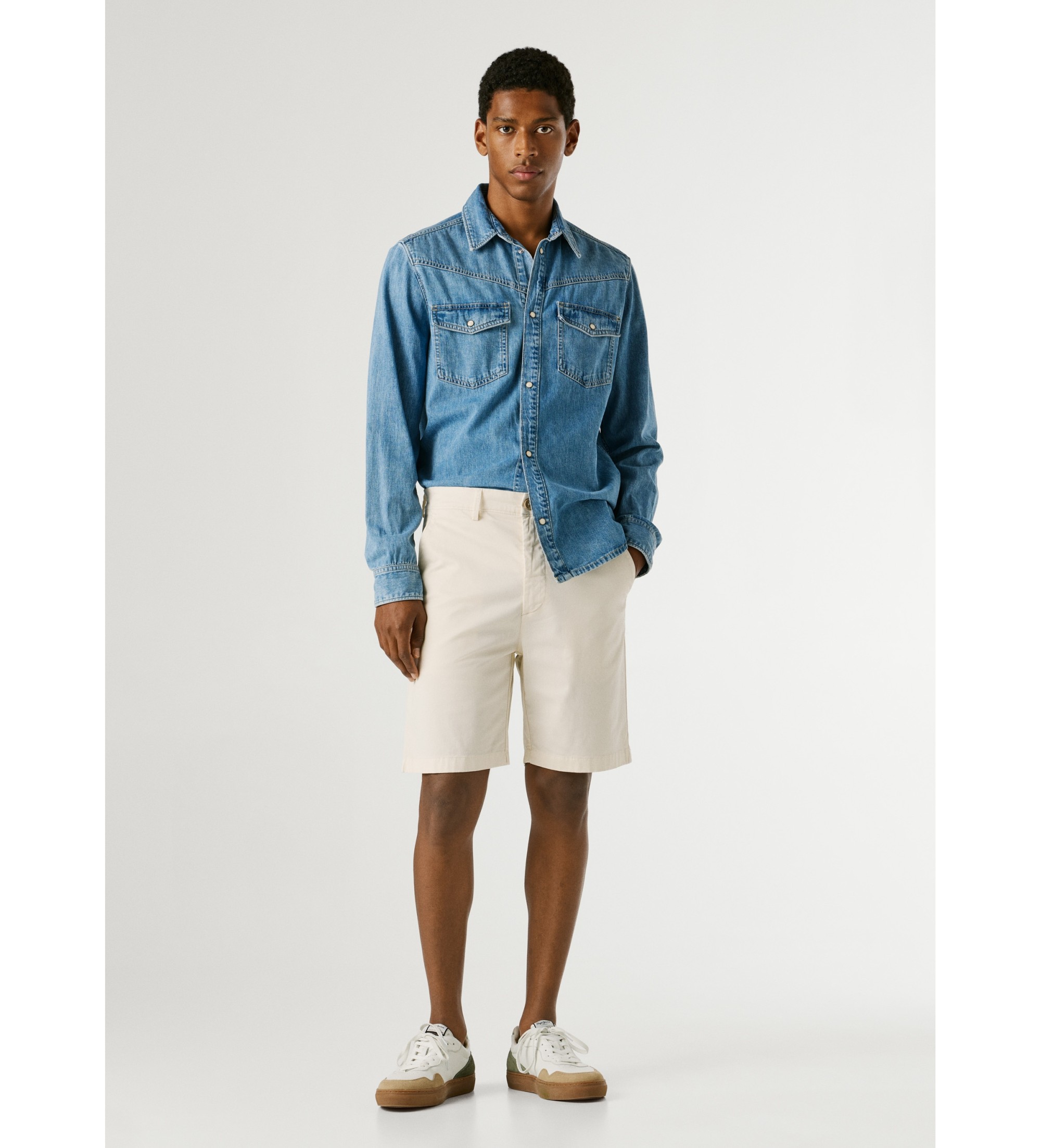 Pantaloncini chino da uomo a vestibilit regolare, di colore bianco. Realizzati in tessuto twill, questi pantaloncini offrono una sensazione di comfort e una vestibilit naturale. Il lavaggio del capo, con tintura reattiva, definisce il colore e garantisce una finitura uniforme. Dettagli funzionali, come le tasche posteriori con bottoni, mantengono una silhouette pulita e pratica. Materiale principale: 97% cotone con un tocco di elastan per una maggiore libert di movimento.
