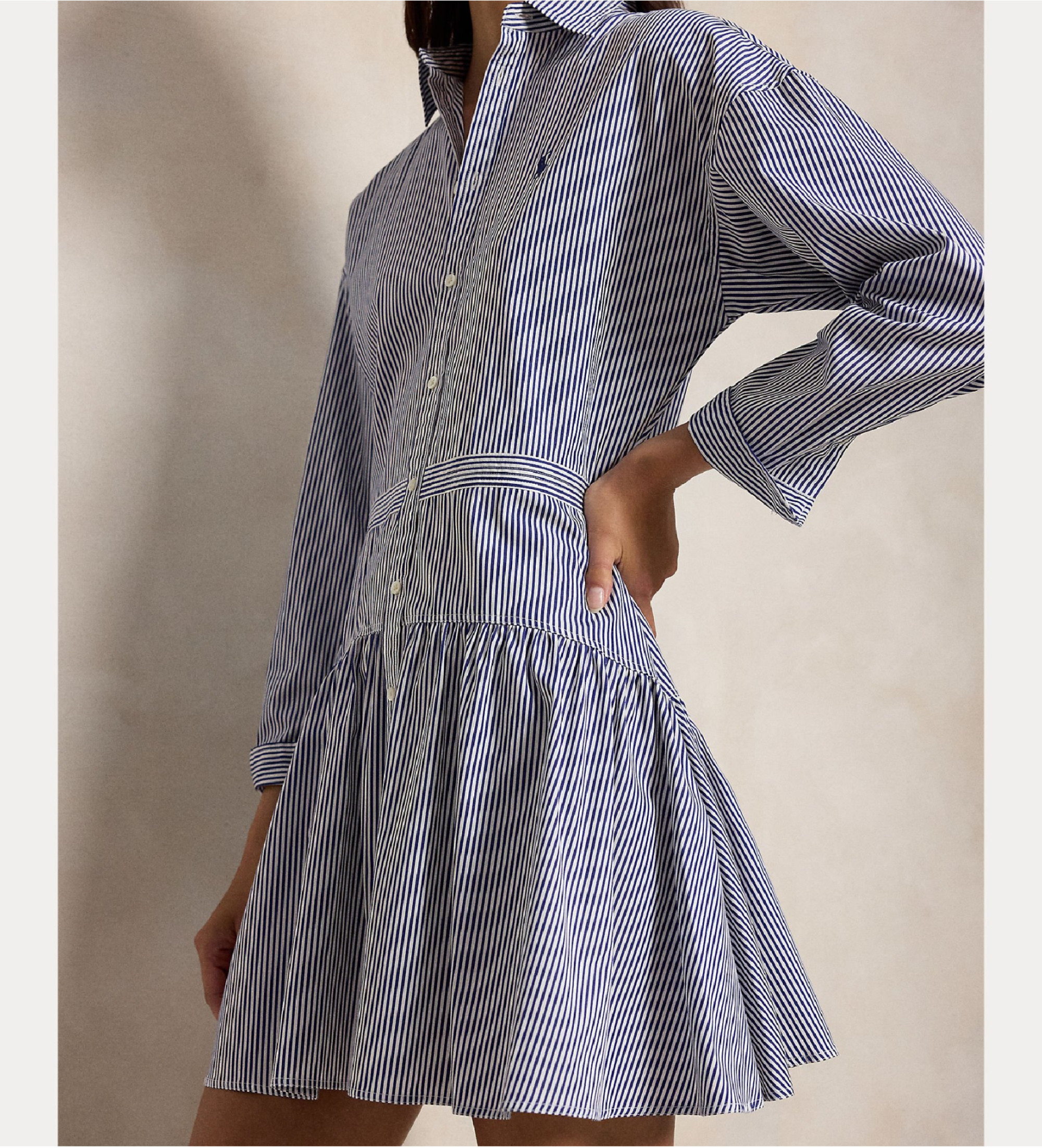 Questo abito-camicia a righe, a trapezio, con pannelli e gonna arricciata, è realizzato in morbido popeline di cotone. Il nostro esclusivo pony ricamato e i bottoni a conchiglia scintillanti aggiungono un tocco sofisticato.