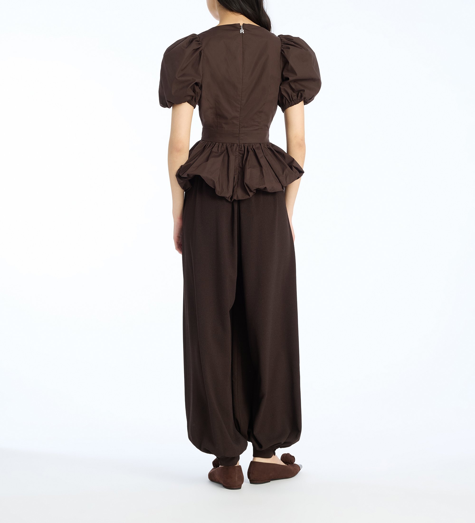 Questo top a palloncino marrone scuro con maniche a sbuffo presenta un taglio femminile ed realizzato in cotone biologico con una morbida fodera in cotone. Presenta maniche corte a sbuffo, un profondo scollo a V con dettaglio di nodo frontale e una vita aderente. L'orlo voluminoso crea una silhouette a peplo, aggiungendo un tocco di eleganza e stile moderno.