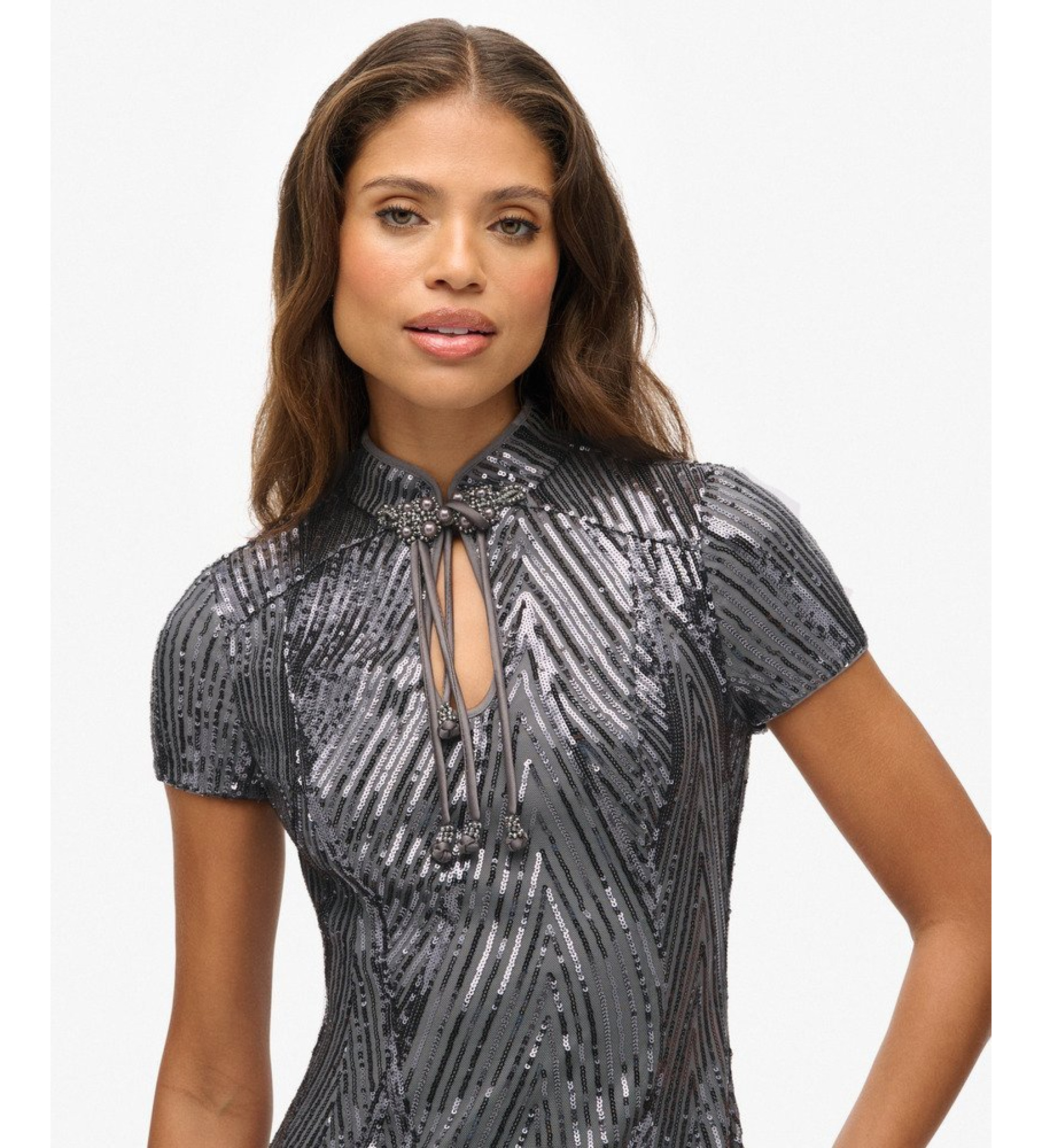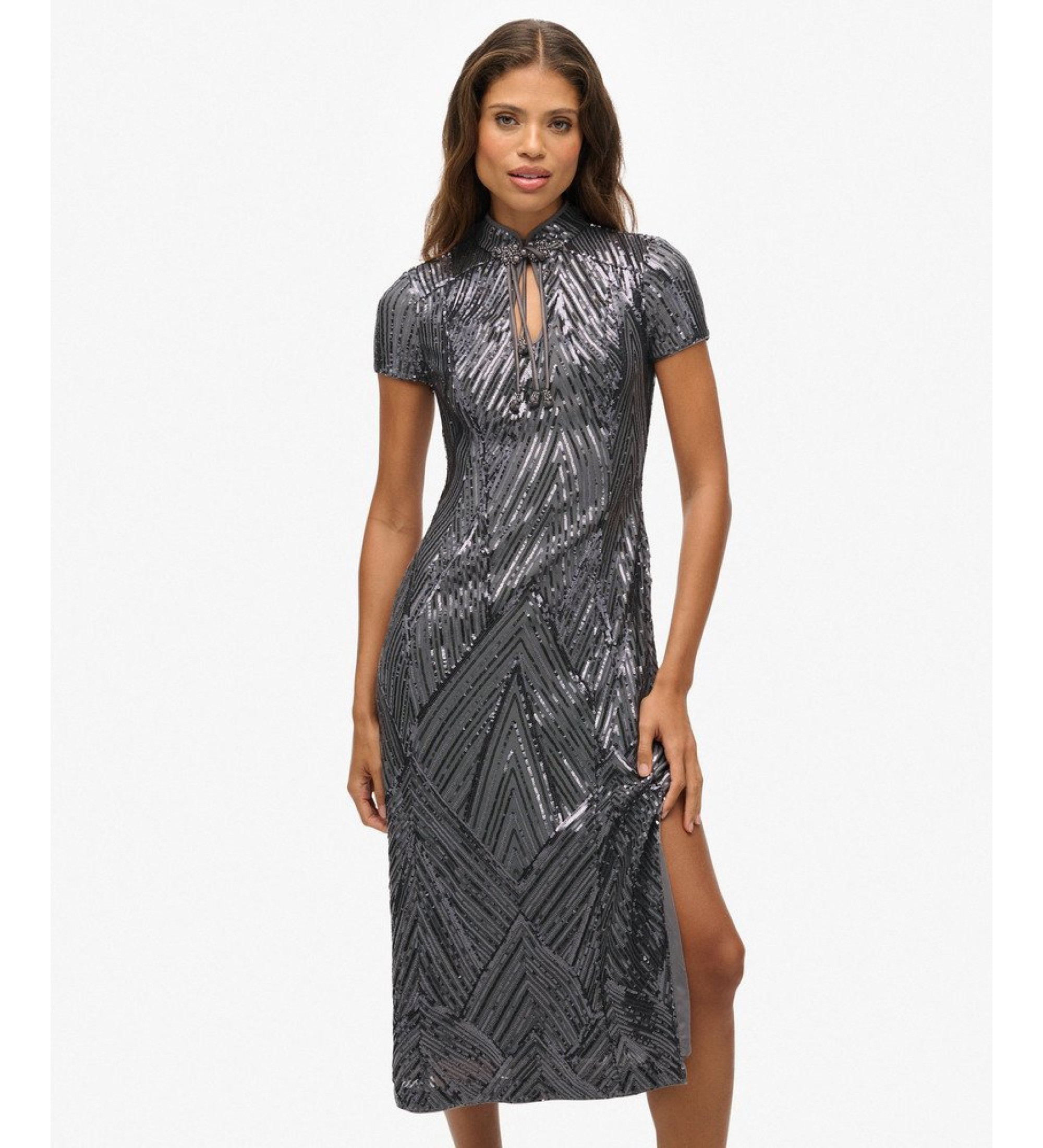 Questo abito midi con paillettes alla coreana presenta un taglio aderente che esalta la silhouette femminile con eleganza e raffinatezza. Il design sartoriale include un colletto alla coreana e una chiusura posteriore con zip, completata da un bottone automatico sul collo per una finitura perfetta. Completamente foderato per il massimo comfort, questo abito misura 118 cm nella taglia UK 10. Ideale per brillare in qualsiasi evento festivo, l'abito è decorato con intricati dettagli di paillettes e una splendida scollatura, che mette in mostra il tuo stile unico con la massima eleganza.