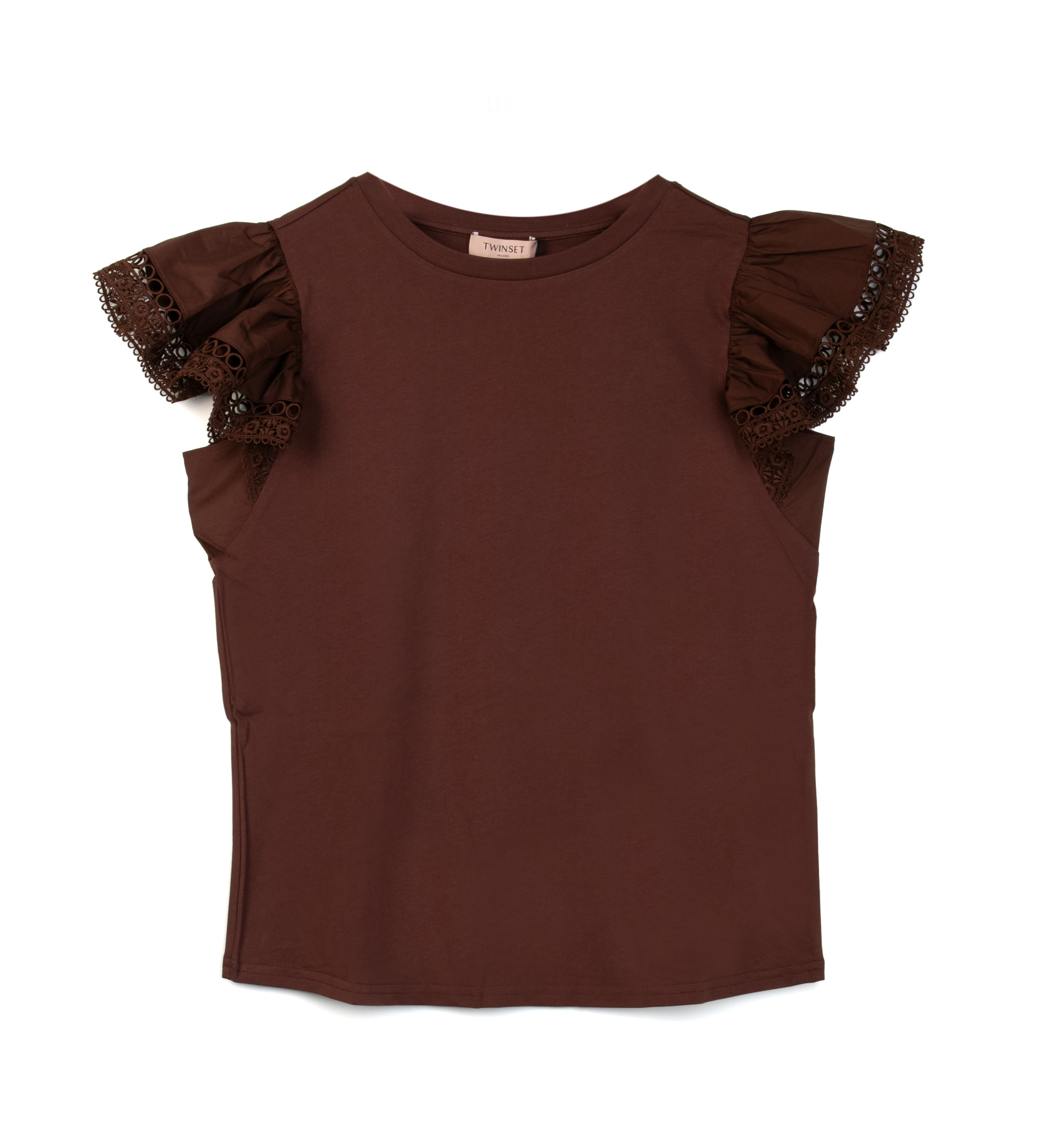 T-shirt color cioccolato con maniche a balze e dettagli in pizzo sangallo. Un capo che bilancia casual e romantico, ideale per arricchire i look quotidiani con un tocco di femminilit.