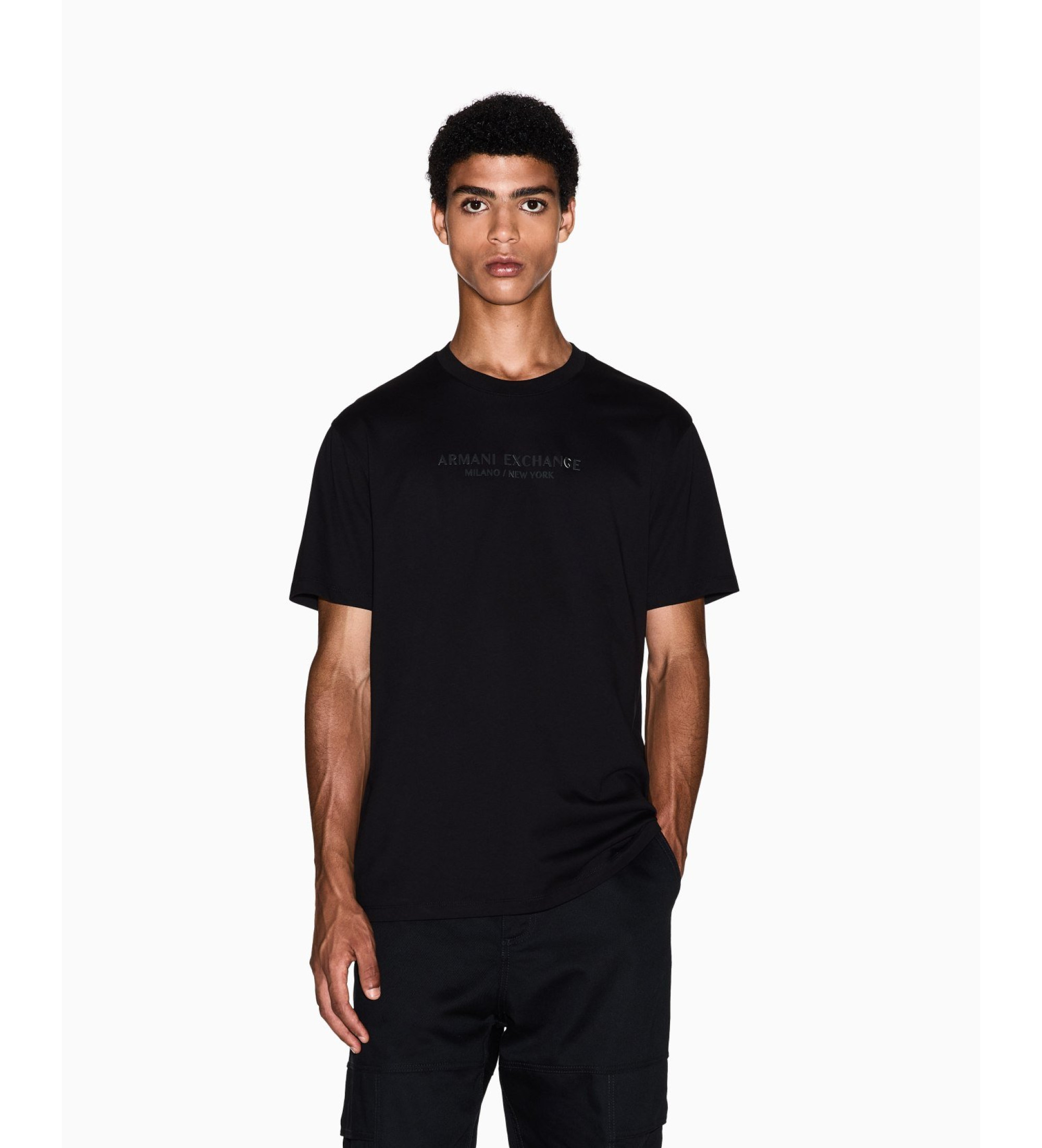Zacht katoenen T-shirt van jersey, onmisbaar voor liefhebbers van een minimalistische stijl met een opvallend accent. Dit kledingstuk valt op door het elegante "Armani Exchange Milano / New York" opschrift tone on tone gedrukt op de borst, een geraffineerd detail dat de aandacht niet op zichzelf vestigt, maar wel gewaardeerd wordt. Met zijn klassieke ronde hals en korte mouwen biedt het comfort en ongelooflijke veelzijdigheid voor je dagelijkse looks.