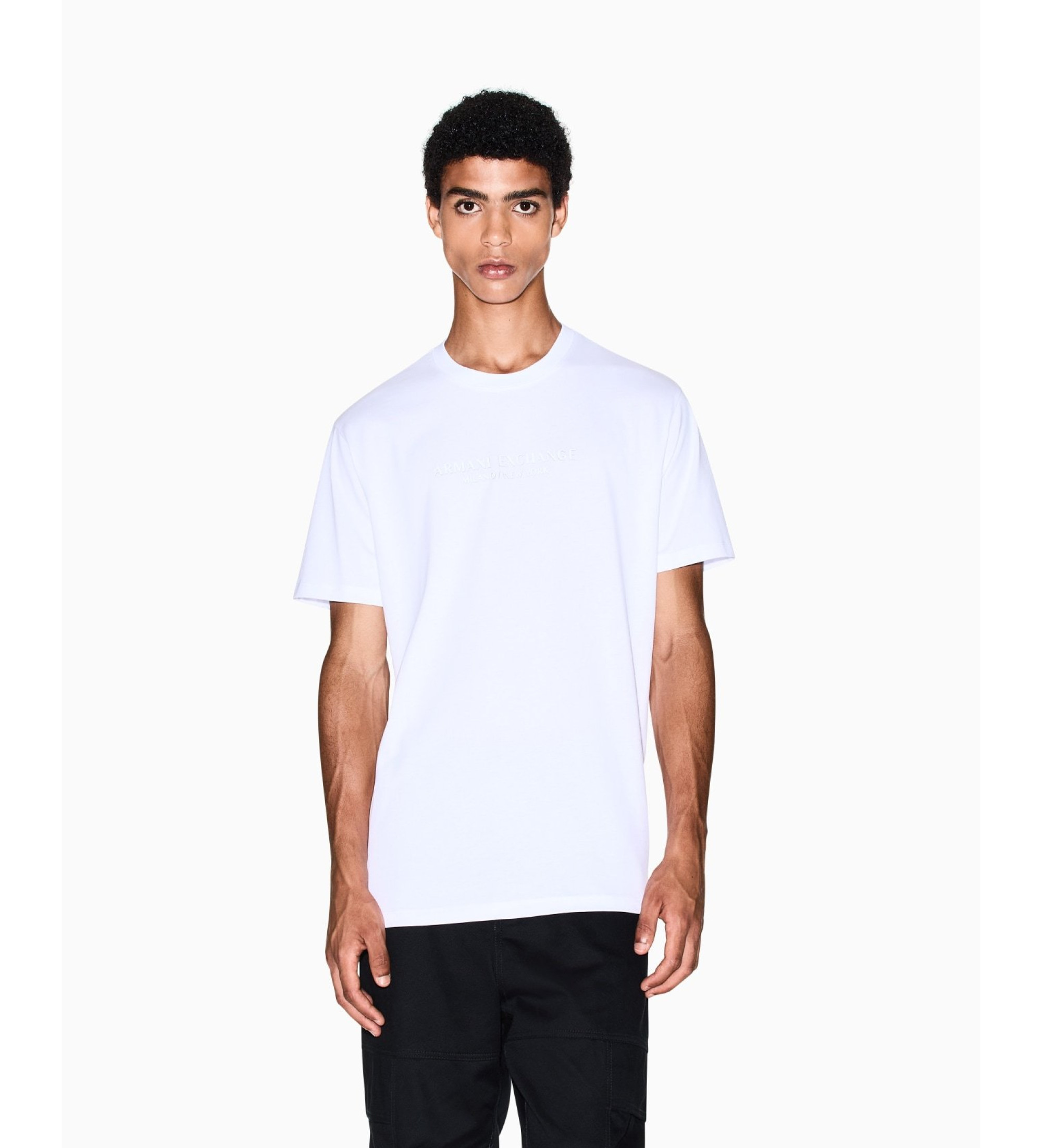 Zacht katoenen T-shirt van jersey, onmisbaar voor liefhebbers van een minimalistische stijl met een opvallend accent. Dit kledingstuk valt op door het elegante "Armani Exchange Milano / New York" opschrift tone on tone gedrukt op de borst, een geraffineerd detail dat de aandacht niet op zichzelf vestigt, maar wel gewaardeerd wordt. Met zijn klassieke ronde hals en korte mouwen biedt het comfort en ongelooflijke veelzijdigheid voor je dagelijkse looks.