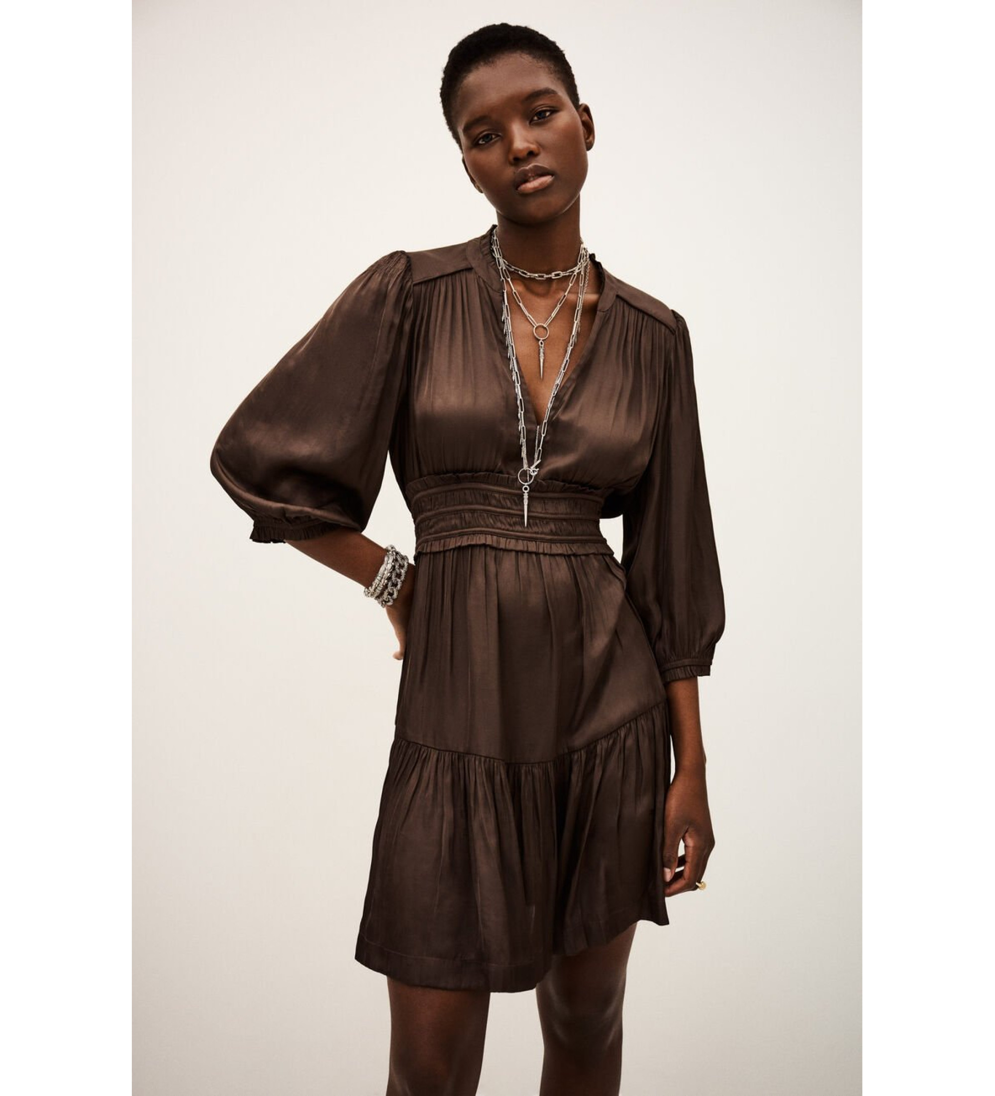 De bruine Cyriala jurk van Ba&sh combineert vrouwelijkheid en beweging met de kenmerkende bohemian vibe van het merk. Het korte A-lijn silhouet flatteert het figuur, terwijl de ruches en ruches details een romantische en nonchalante touch toevoegen. Perfect om te dragen met zowel laarzen als sandalen, afhankelijk van het seizoen.