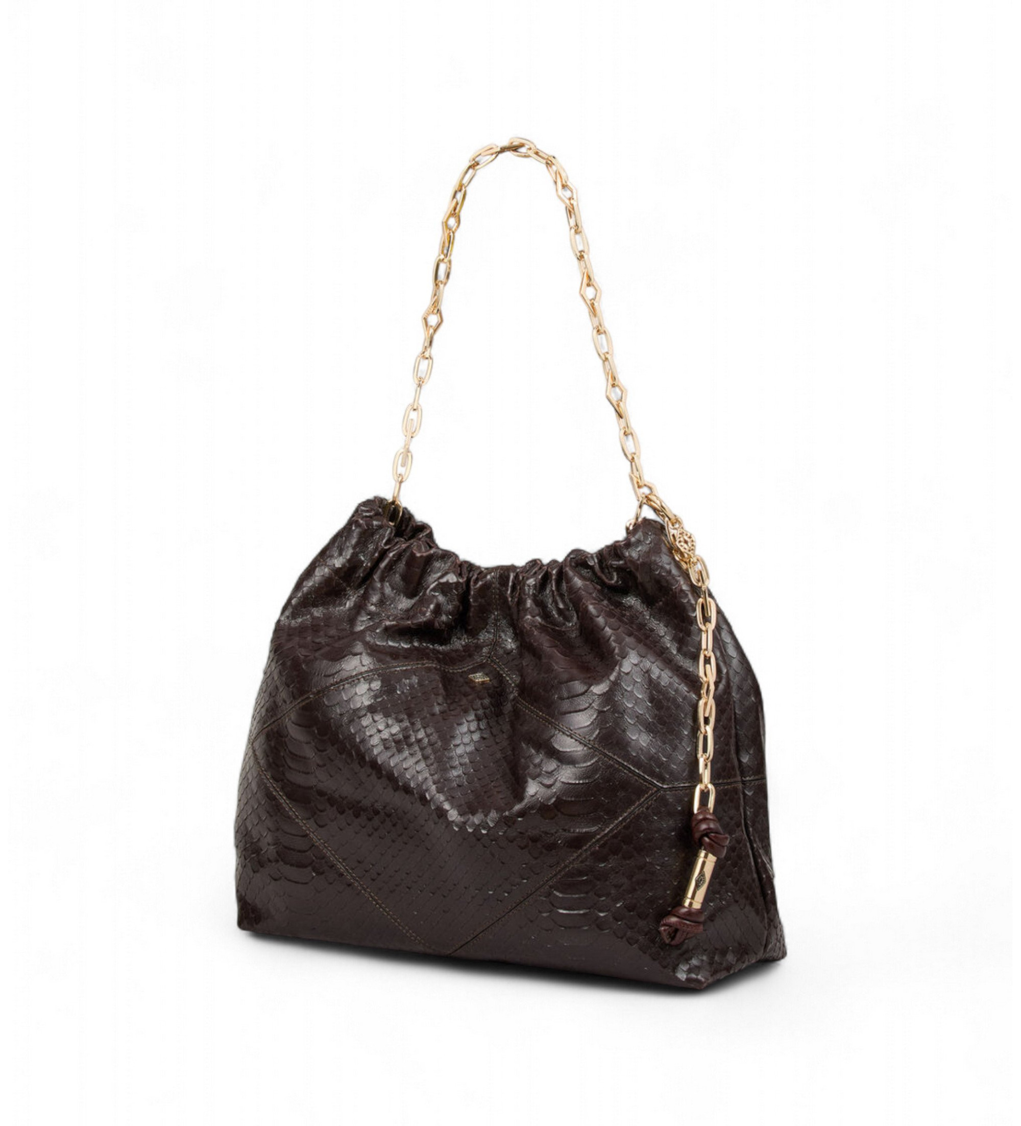 De bruine June tas van Ba&sh is een iconisch stuk dat ambachtelijke savoir-faire combineert met eigentijds design. De rechthoekige vorm en delicate plooien aan de bovenkant geven de tas een geraffineerde uitstraling, terwijl de antieke metalen biezen en de ingelegde ketting een vleugje boho chic elegantie toevoegen. Een veelzijdige tas met karakter, perfect om bij elke gelegenheid mee te nemen.
