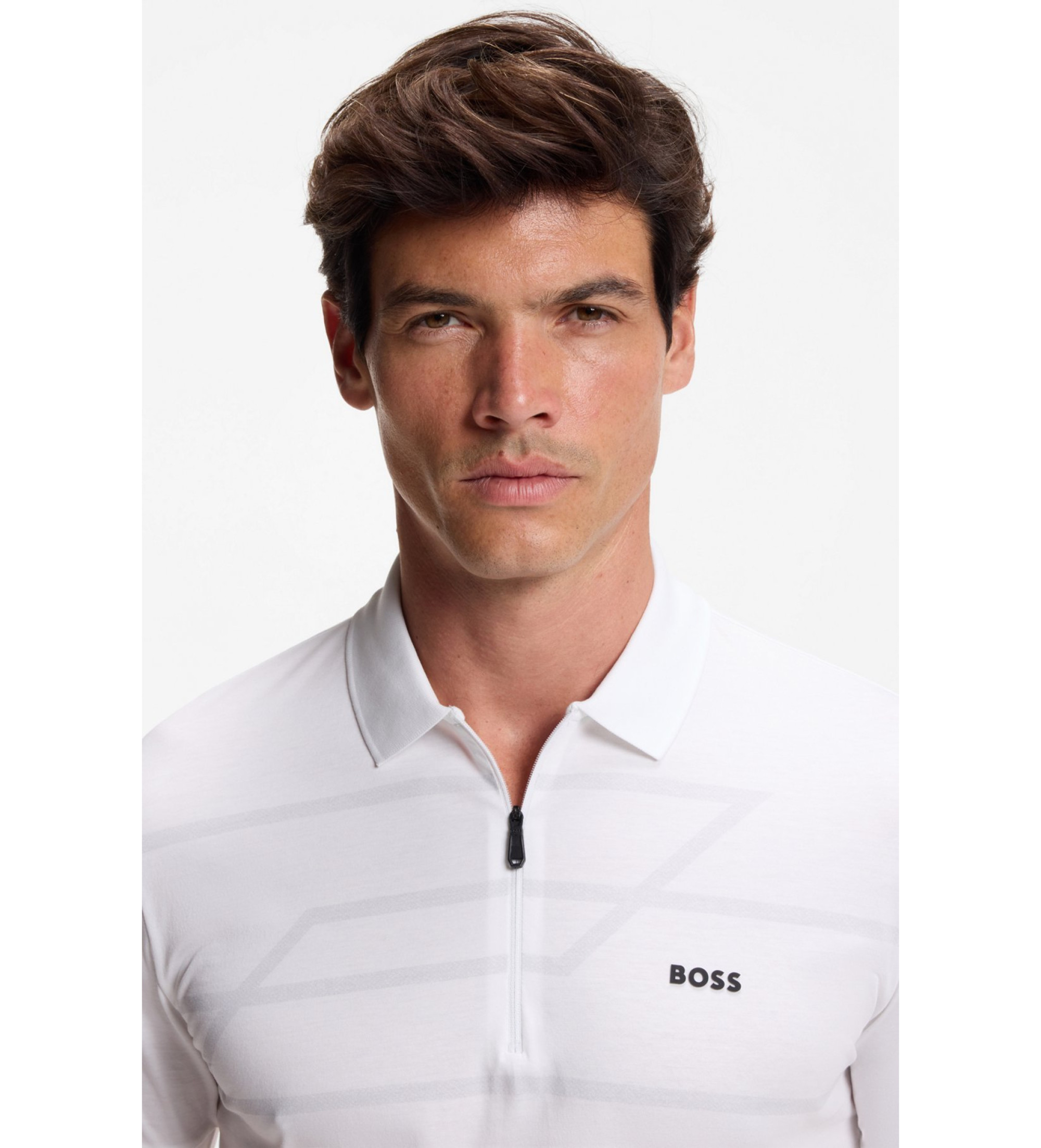 Dit BOSS Menswear poloshirt met dynamische gevlekte print is een geweldige keuze voor actieve dagen. Sneldrogende katoenen jersey. Zak met rits. Slanke pasvorm.