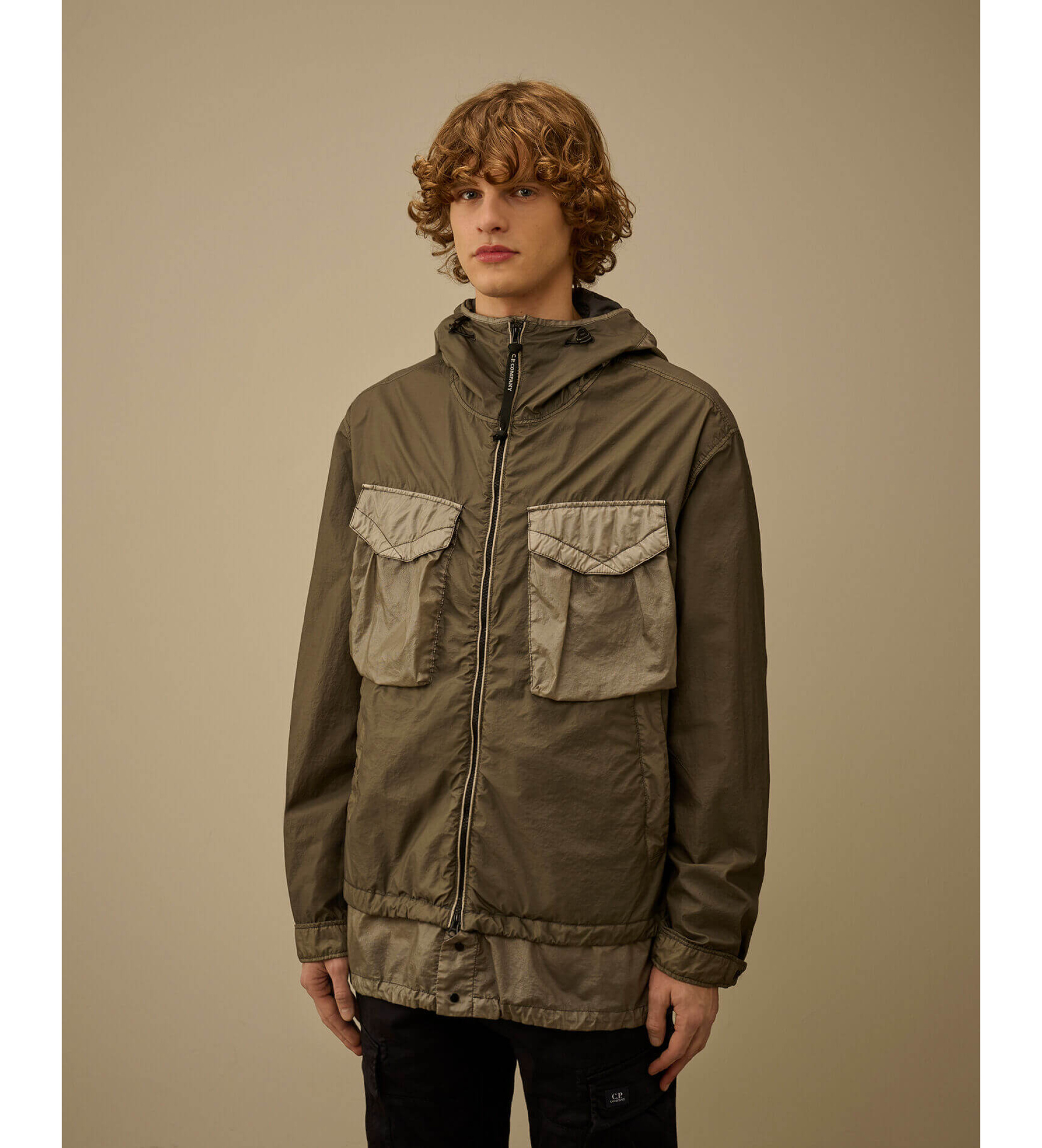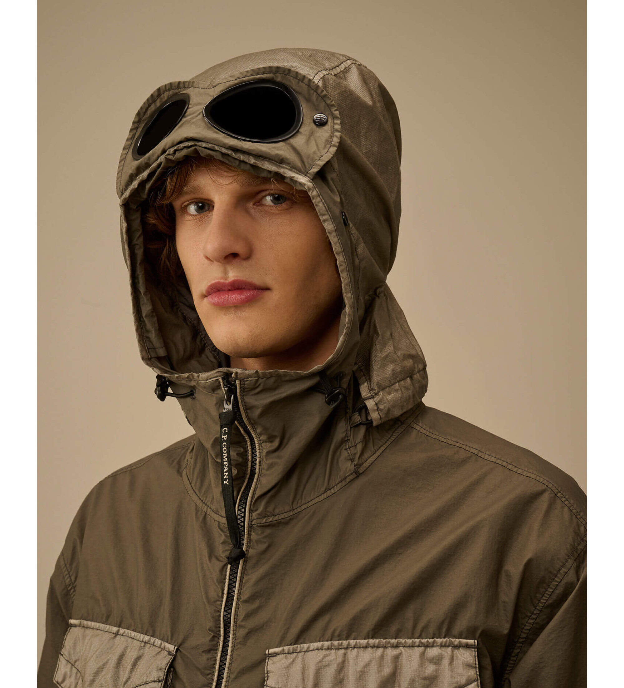 Goggle jacket gemaakt van Bi-TM Mixed, een 20D nylon met polyurethaan coating en matte velours textuur. Het jack heeft een verstelbare en afneembare opalen Goggle capuchon, tweeweg ritssluiting en klepzakken op de borst in dezelfde contrasterende Opal stof. Het ontwerp wordt gecompleteerd door zijzakken met klepsluiting, verstelbare manchetten met drukknopen en een opalen inzetstuk onderaan met drukknopen. De stof is geverfd voor een unieke kleurdiepte en tonale variaties die na verloop van tijd veranderen. Normale pasvorm.