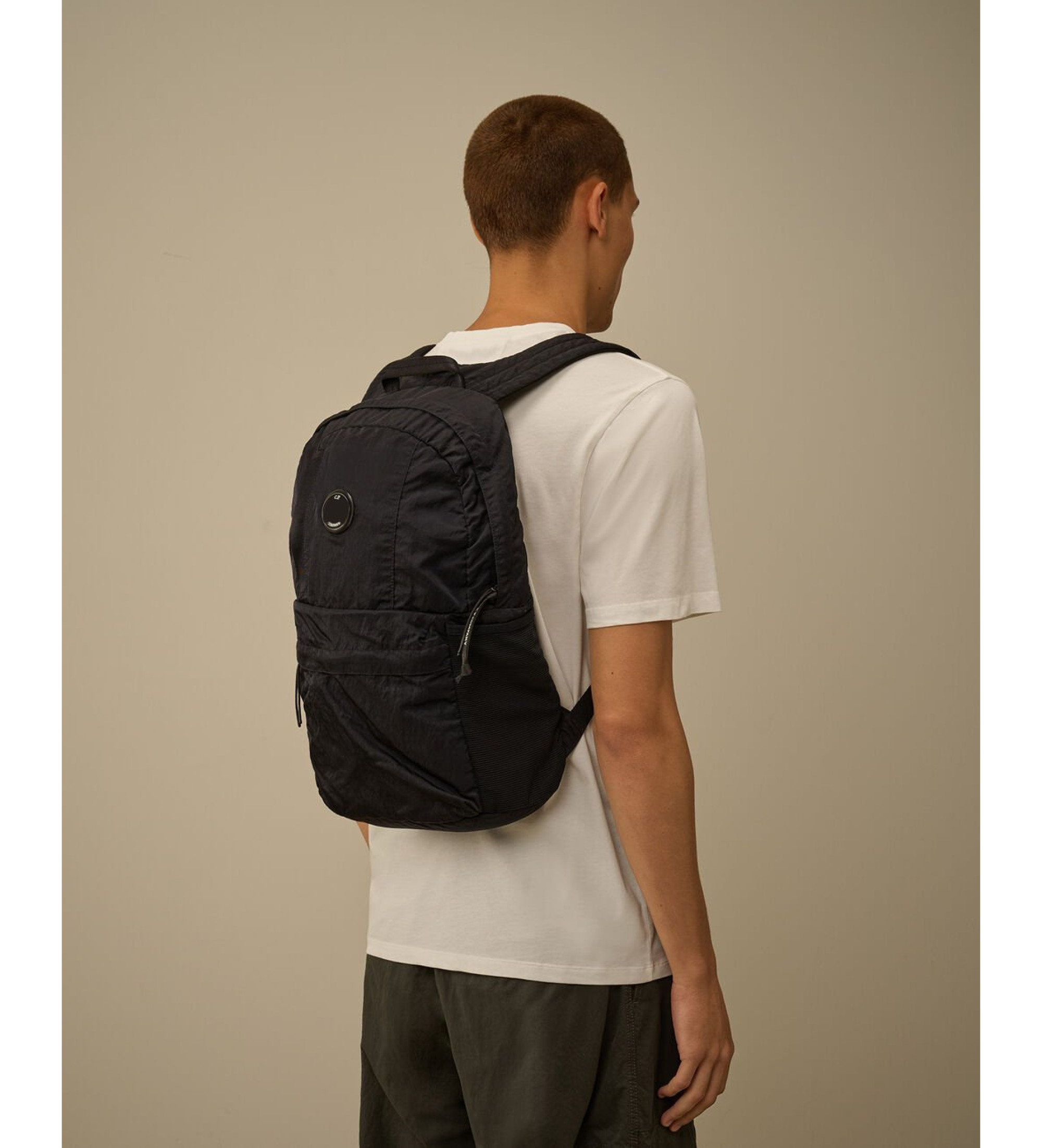 Rugzak gemaakt van Nylon B, een militair genspireerde multifilament satijnen nylon. Voorzien van verstelbare gespriemen, gewatteerde schouderriemen en een handvat. Het ontwerp bevat een verborgen zak met rits met de iconische CP Company lens, een bodemzak met rits, gaas aan de zijkant en een binnenzak met drukknopen. Kleding geverfd en behandeld tegen vallen.