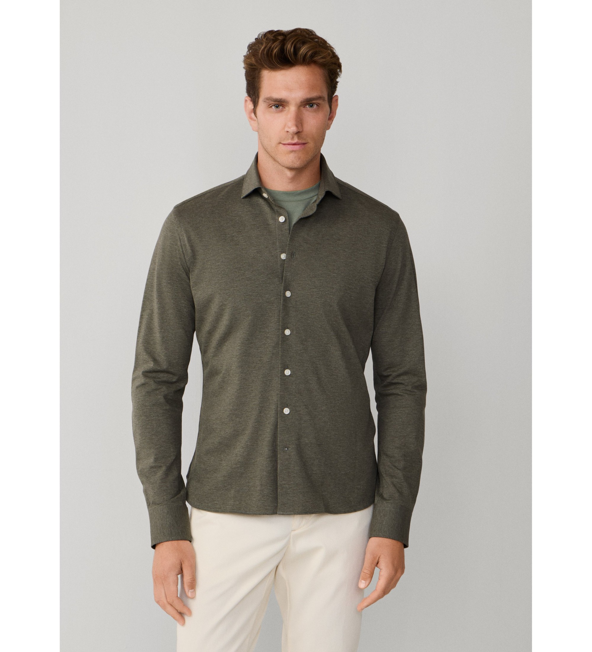 Een overhemd ontworpen voor mannen dat een nette uitstraling combineert met dagelijks comfort. Het overhemd heeft een getailleerde pasvorm en is gemaakt van 100% piqué jersey katoen in groen voor textuur en een zacht gevoel. Het heeft een Kent-kraag en Franse sluiting voor een nette look en een lint met logo op de manchet voor een opvallende touch. Het is veelzijdig en geraffineerd en doet het net zo goed in casual looks als in smart-casual combinaties.