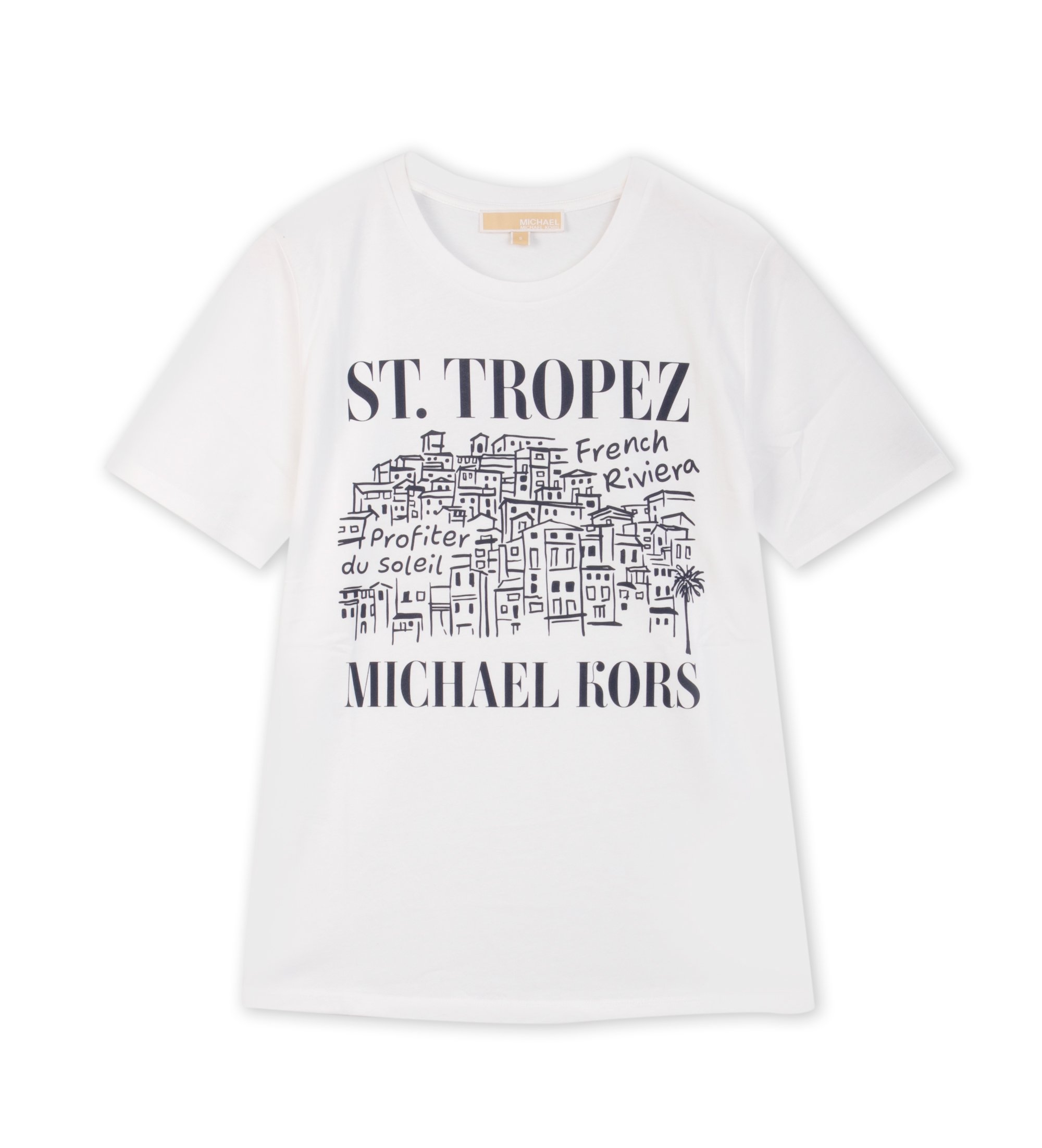 Katoenen T-shirt van Michael Kors met een grafische print genspireerd op de Franse Rivira. Een casual, zomers stuk dat de geest van Saint-Tropez oproept met een gellustreerd ontwerp vol persoonlijkheid, perfect voor strand- of stadslooks wanneer je die vakantie-, mediterrane stijl wilt uitstralen.
