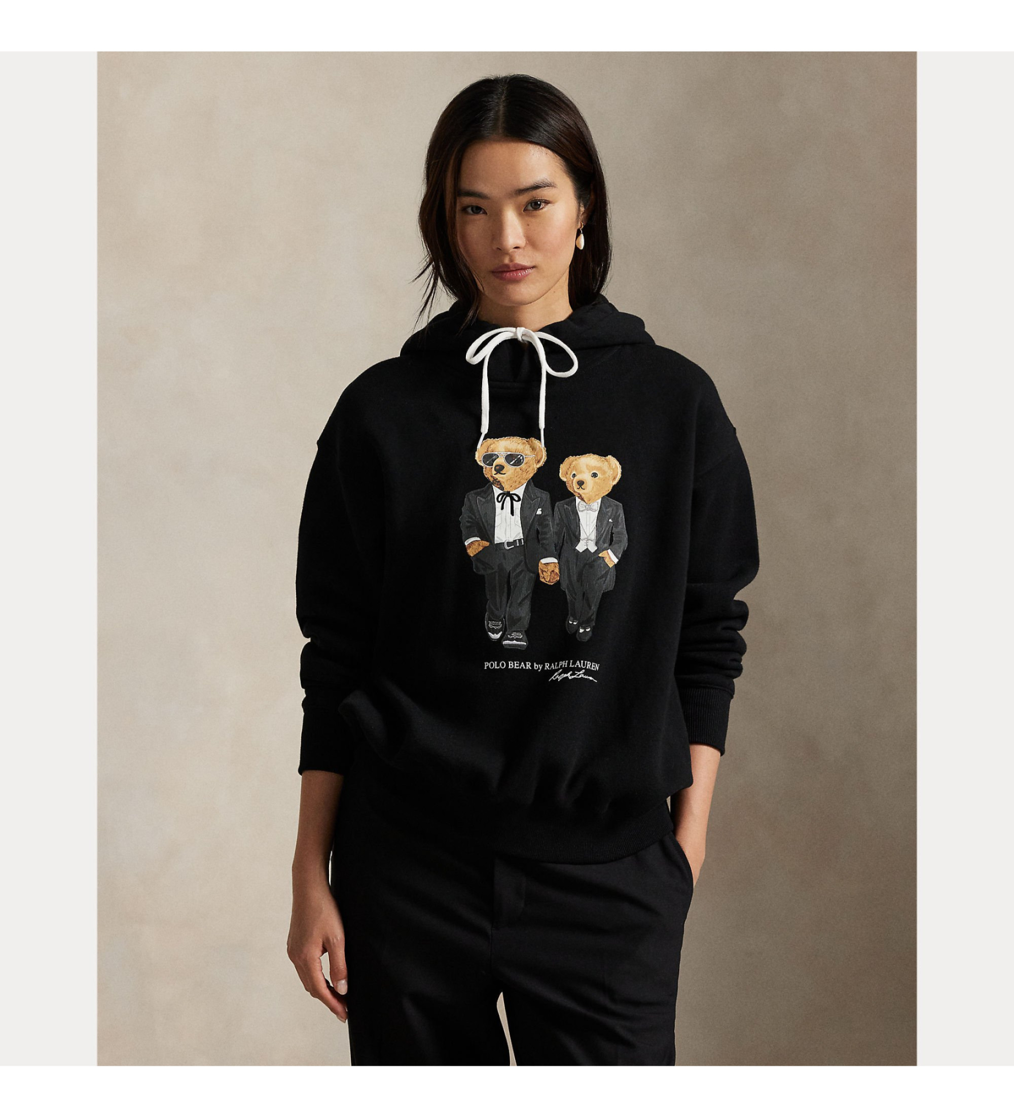 Op deze speciale hoodie staan twee beren in zwarte stropdaskleding. De graphic weerspiegelt de elegantie en opwinding van een speciale gelegenheid en is genspireerd op een iconische foto van meneer en mevrouw Lauren tijdens een prijsuitreiking eind jaren 70.