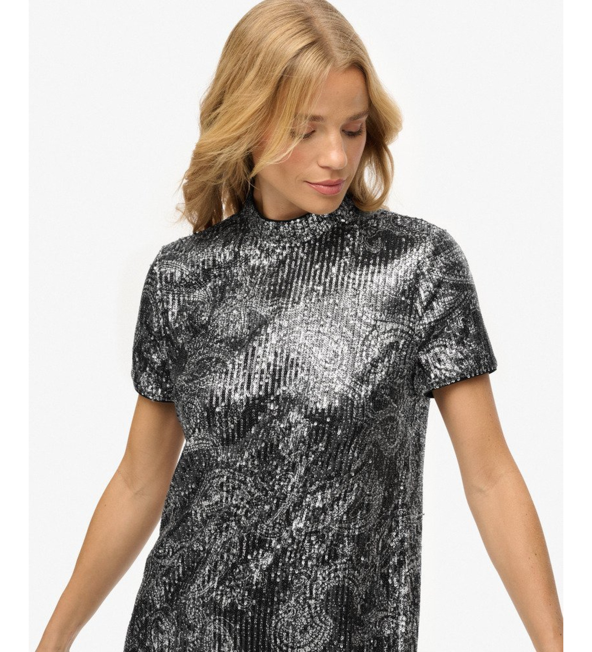 Mini t-shirt stijl jurk met pailletten, een veelzijdige en sprankelende optie voor je feestelijke looks of speciale evenementen.