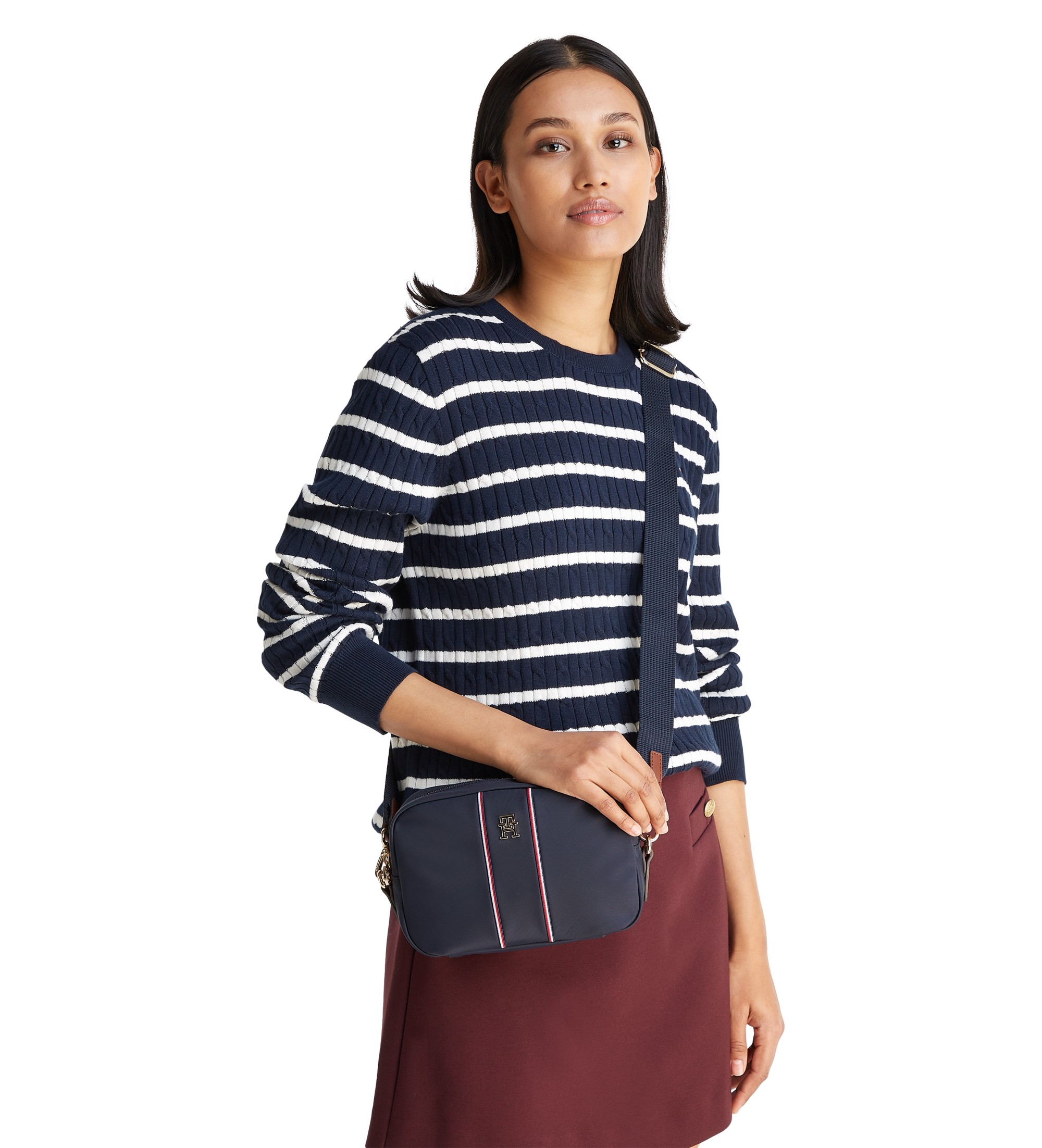 Opvallende geweven details, panelen met ritssluitingen en een TH-monogram geven deze elegante cameratas zijn eersteklas stijlclassificatie.