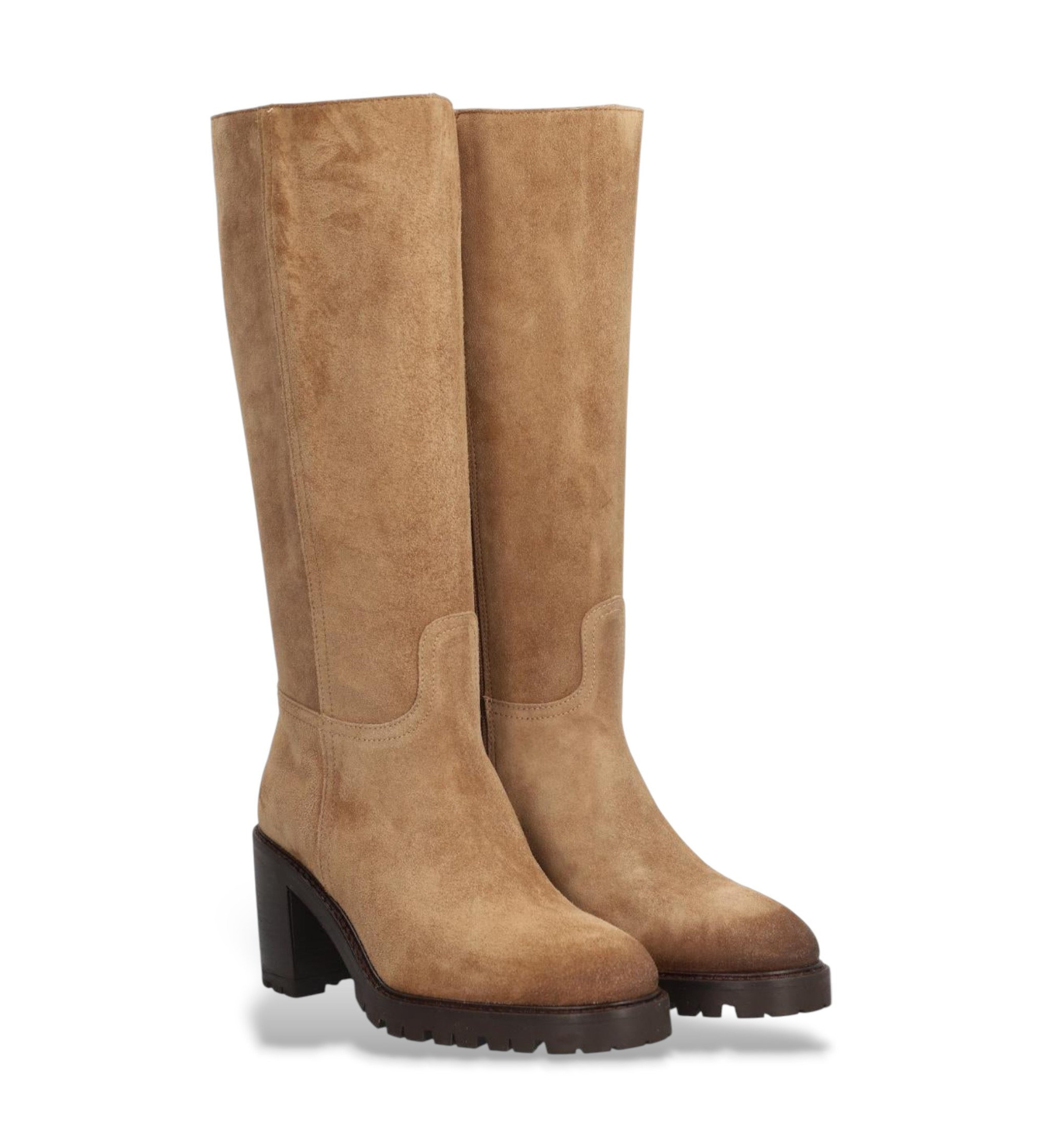 Damskie buty ALPE VALLEY ze skóry w kolorze taupe z miękkim wykończeniem baby silk. Elegancki i wszechstronny design z 8 cm obcasem i wysoką cholewką, idealny do zimowych stylizacji ze stylem i wygodą.