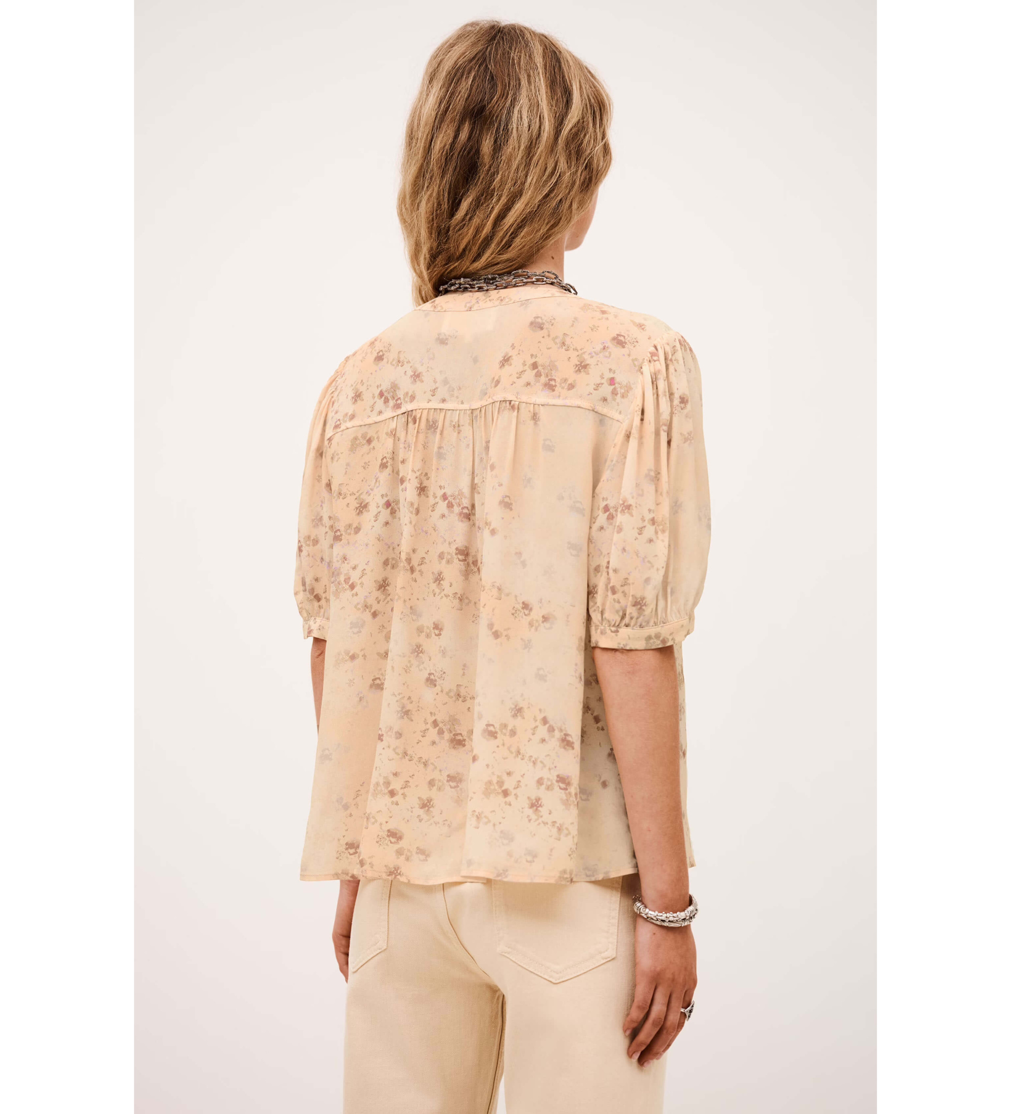 Brzoskwiniowa szyfonowa bluzka z kwiatowym nadrukiem w odcieniach koralu i terakoty. Jej romantyczny i delikatny design sprawia, że jest to idealna bluzka do świeżych i kobiecych stylizacji, idealna zarówno na co dzień, jak i na specjalne okazje.