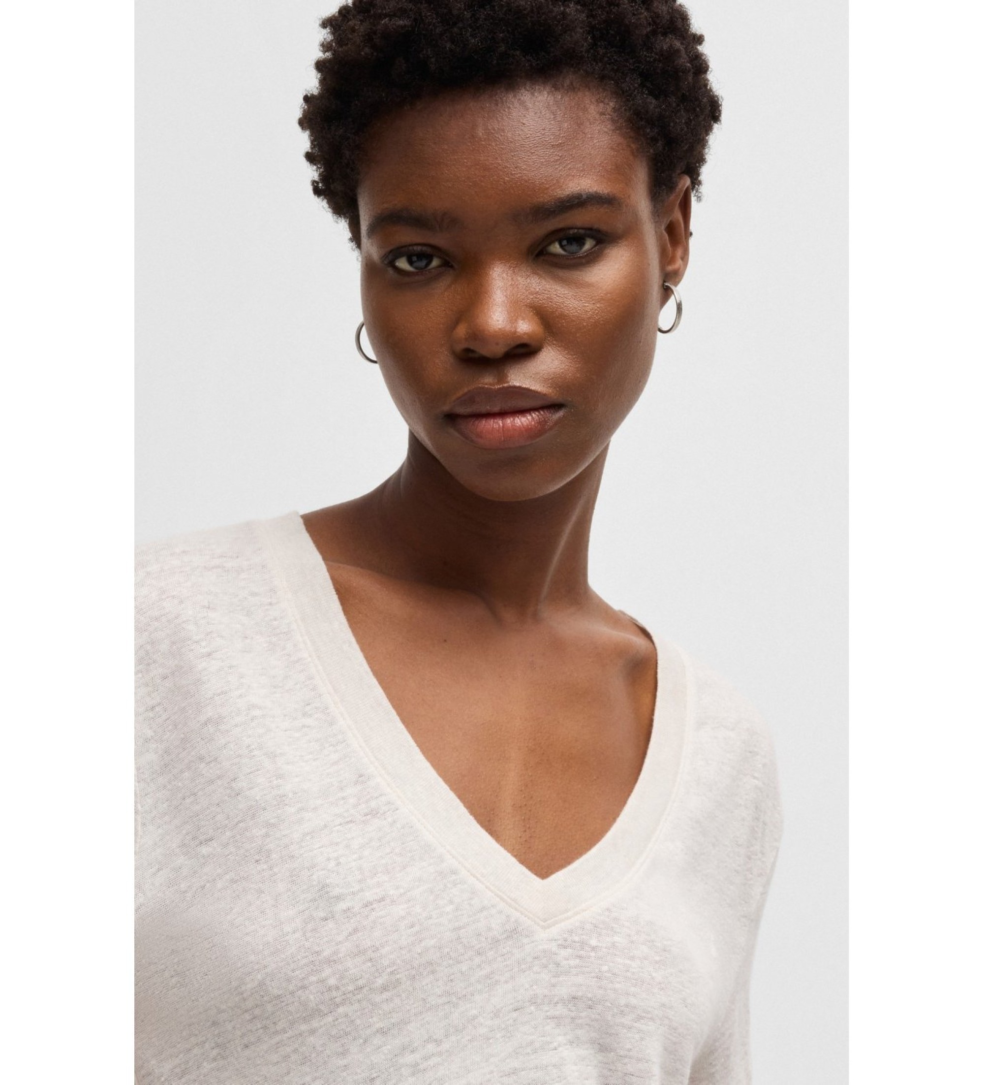 Koszulka z krótkim rękawem w kolorze złamanej bieli z dekoltem w kształcie litery V i płynnym materiałem z naturalnym drapowaniem. Kobiecy i ponadczasowy basic z lekką i dyskretną fakturą, która czyni go najbardziej uniwersalnym elementem garderoby.