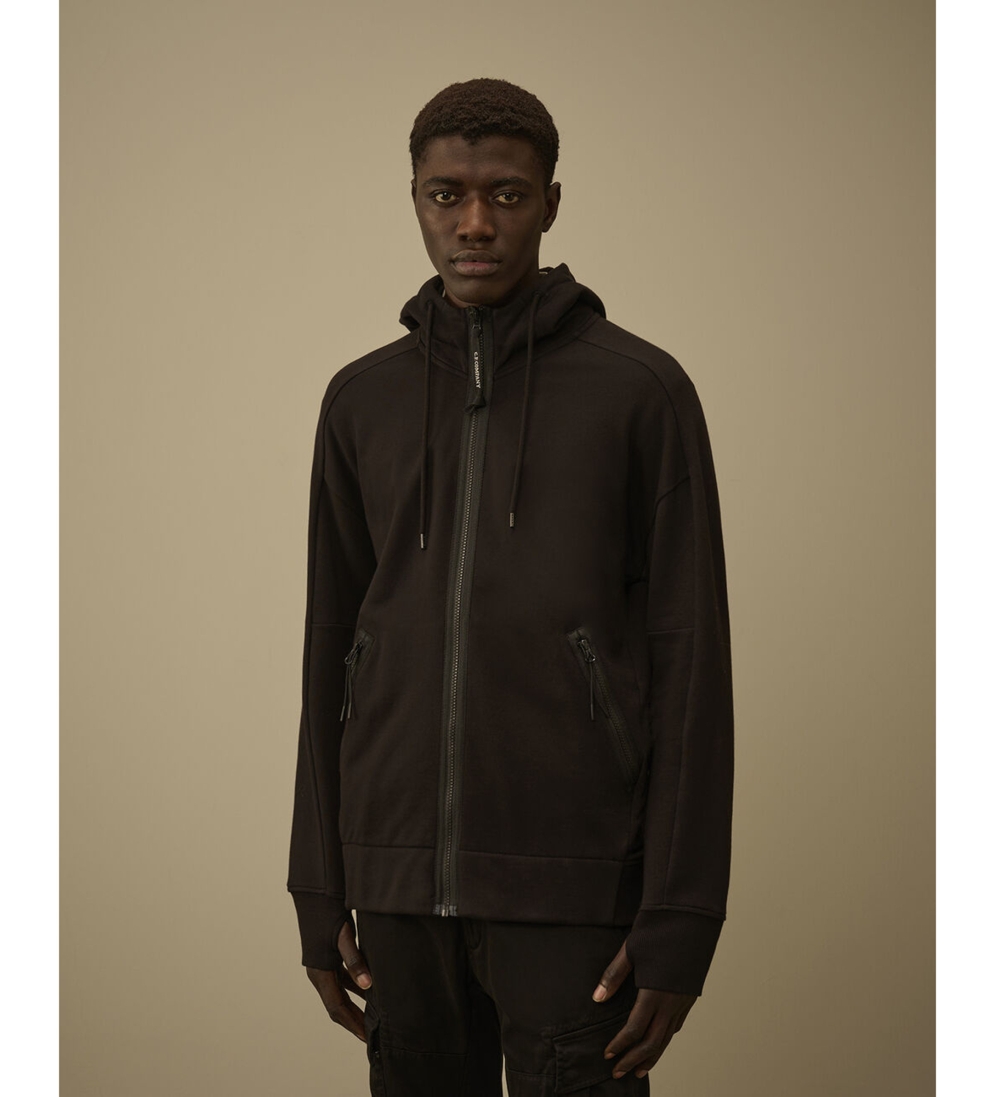 Bluza Goggle wykonana z wytłaczanego ukośnie polaru, średniej grubości szczotkowanej bawełny o ukośnym splocie. Miękki materiał zapewnia wygodę i swobodę ruchów. Bluza posiada kultowy regulowany kaptur Goggle, boczne kieszenie na suwak oraz prążkowane mankiety i dół. W mankietach znajduje się otwór na kciuk. Regularny krój.