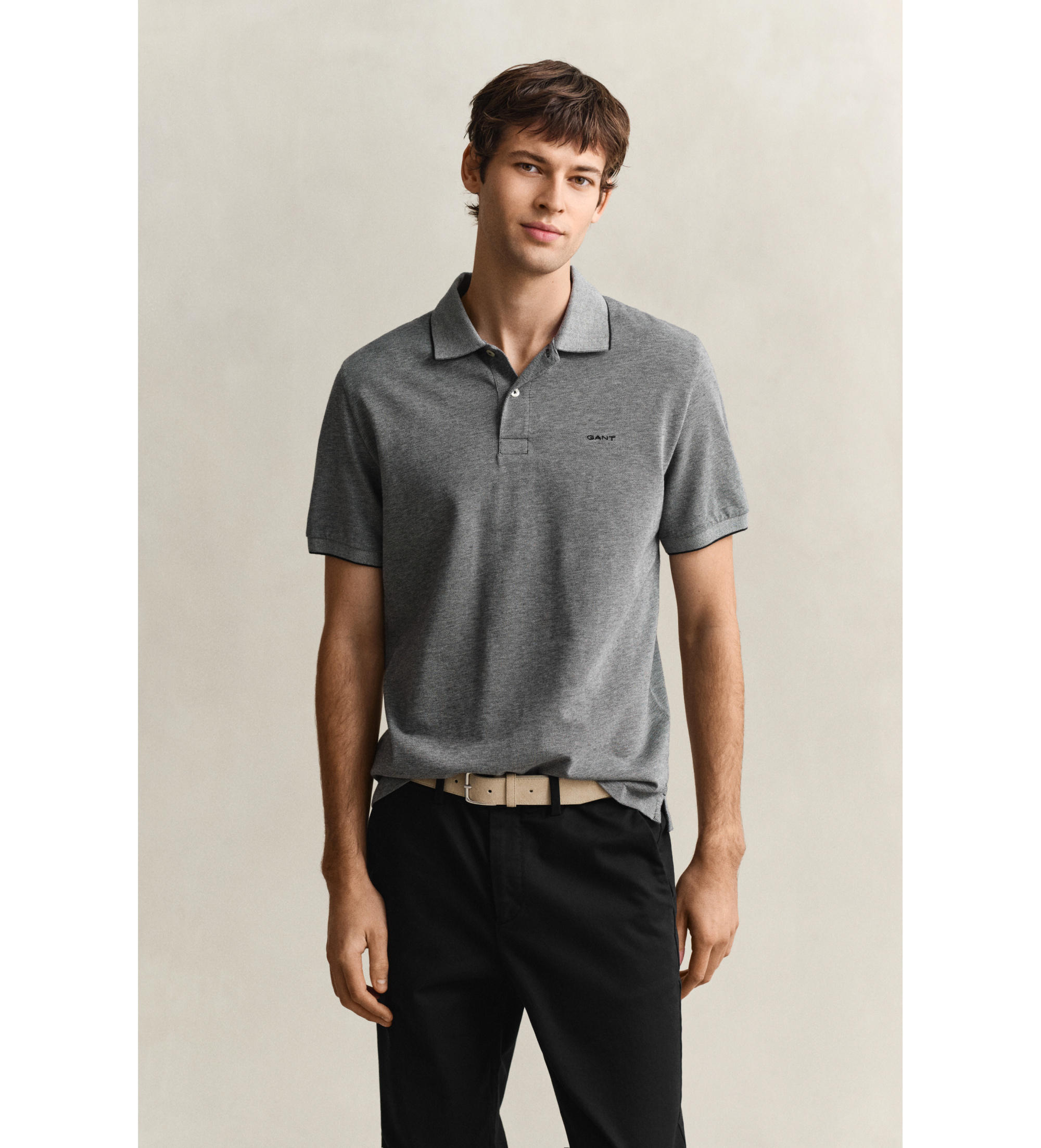 Ta koszulka polo o regularnym kroju jest wykonana w 100% z bawełny o dwukolorowej fakturze pique. Charakteryzuje się również barwionym przędzą wzorem w paski na kołnierzyku z płaskiej dzianiny, zapięciem na dwa guziki, bocznymi rozcięciami u dołu i haftem na piersi.