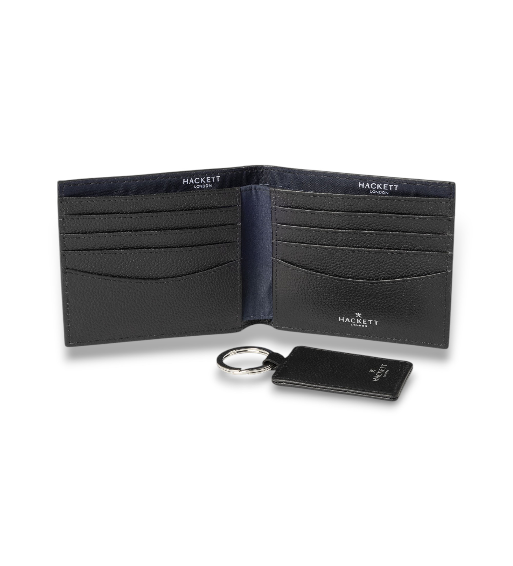 Zestaw upominkowy Hackett London z matowej skóry bydlęcej, łączący w sobie luksus i funkcjonalność. Zawiera składany portfel i prostokątny brelok do kluczy, oba z markowymi detalami, idealne do stylowego codziennego użytku.