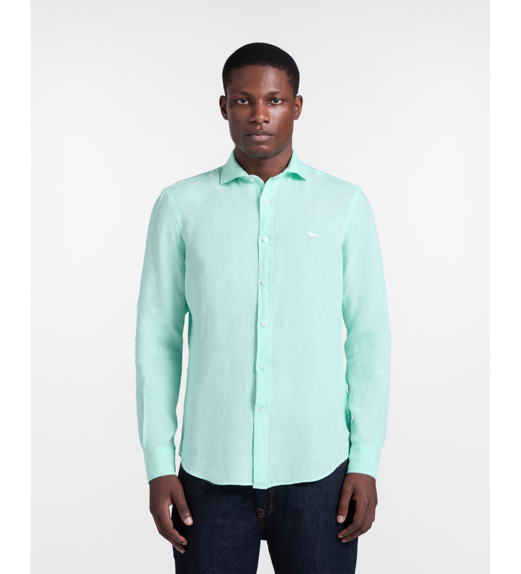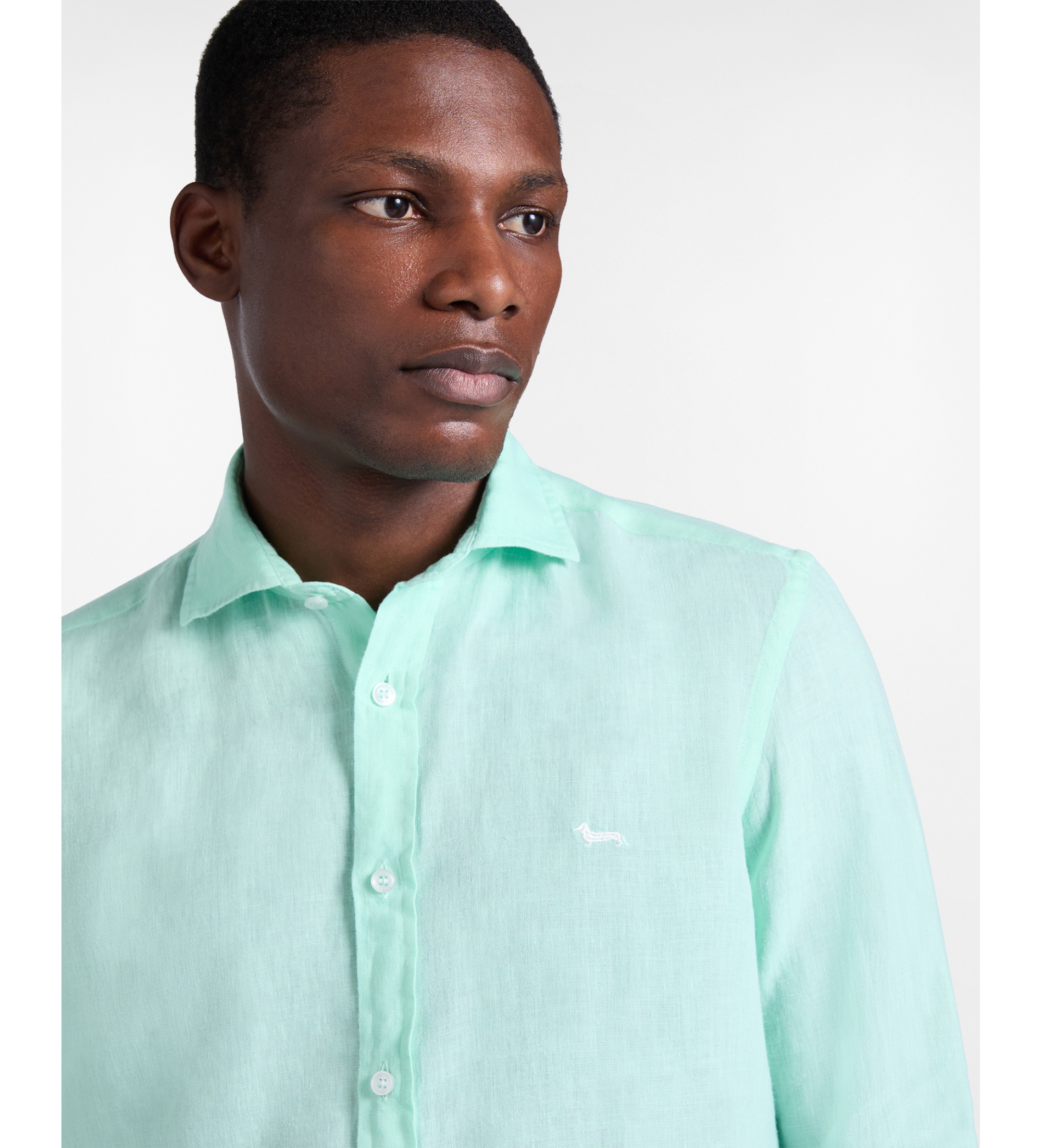 Odkryj tę męską koszulę z czystego lnu, ponadczasowy niezbędnik letniej garderoby. Lniana tkanina gwarantuje wygodę i przewiewność, idealną na cieplejsze pory roku. Kołnierzyk bez guzików i haftowany jamnik na wysokości serca.