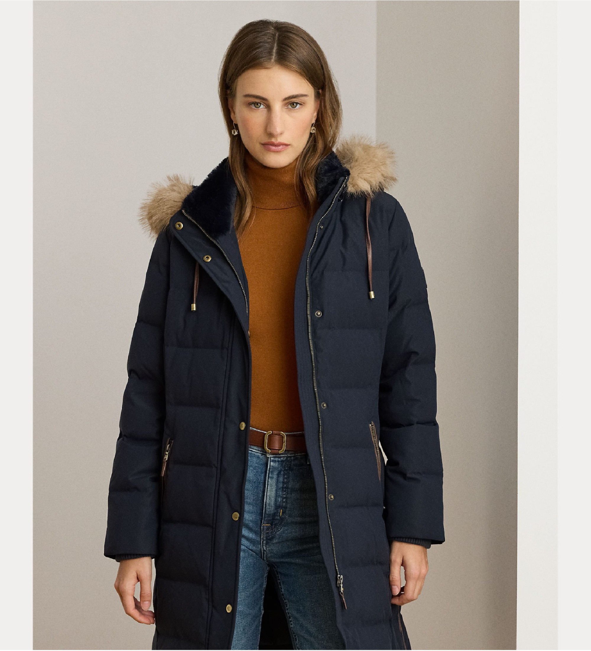 Stylowy i praktyczny, ten prążkowany pikowany płaszcz został zaprojektowany z odpinanym kapturem z wykończeniem ze sztucznego futra, wodoodporną powłoką zewnętrzną i ciepłym puchem 450 cuin Fill Power, aby utrzymać ciało suche i ciepłe. Księżniczkowe szwy z przodu i z tyłu podkreślają opływową sylwetkę, a metalowe zatrzaski z wygrawerowanymi inicjałami "LRL" dodają charakterystycznego akcentu.