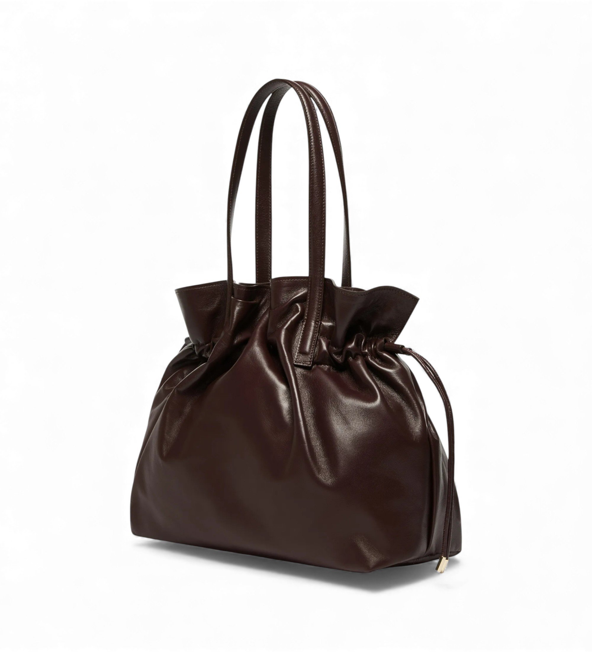 Ta duża, pojemna torba to idealny wybór do życia w mieście. Zapięcie na sznurek tworzy delikatną falbankę, która podkreśla wspaniałą skórę nappa quadów.