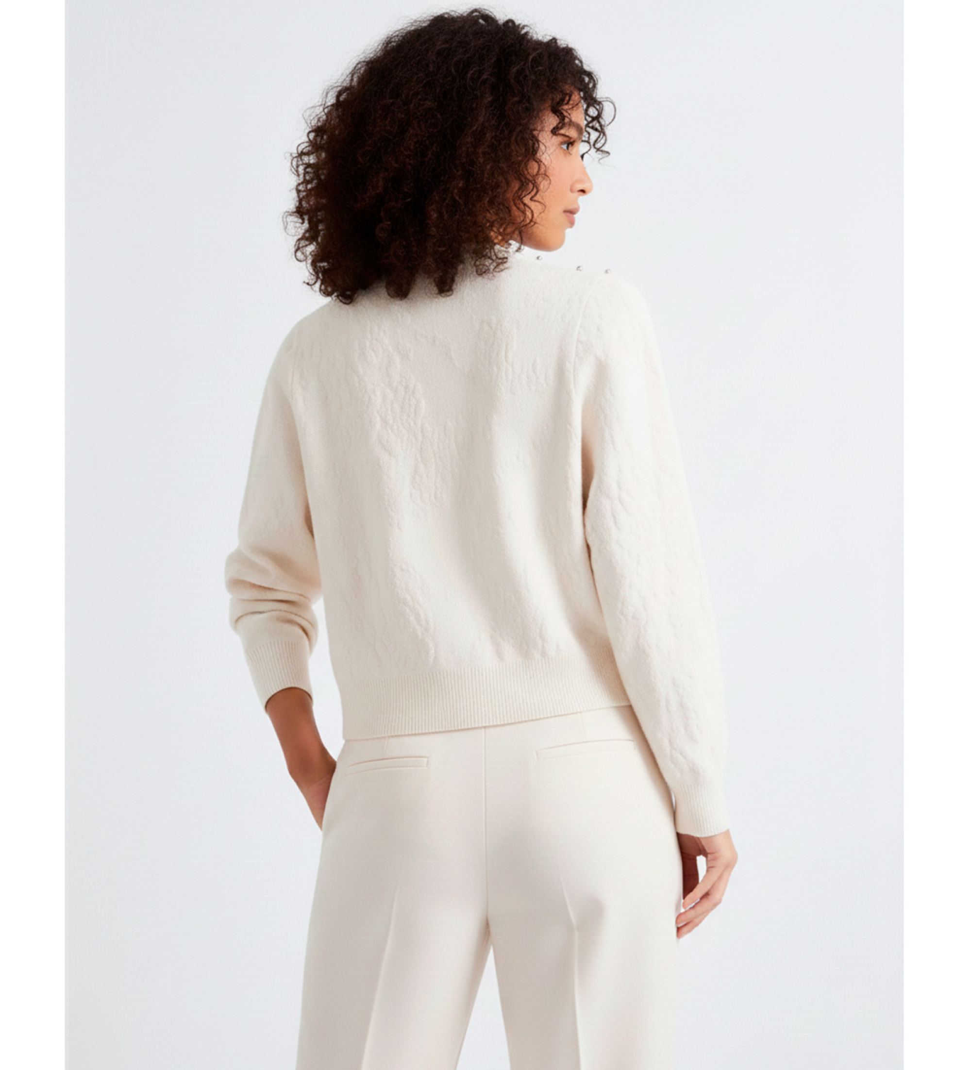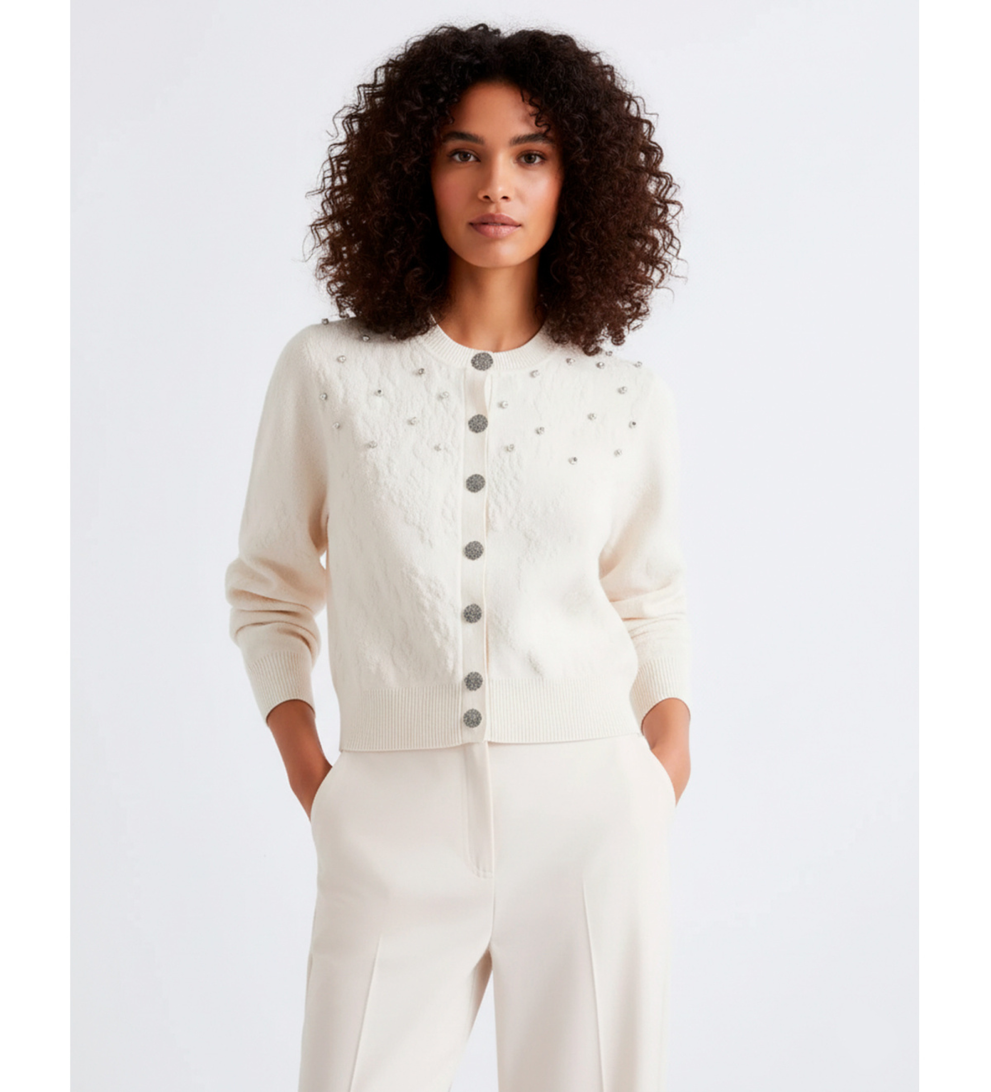 Dzianinowy kardigan powraca do mody i tym razem pojawia się w lekkiej wersji na nowy sezon. Biżuteryjne guziki i haftowane kryształy kaboszonowe u góry dodają efektownego akcentu.