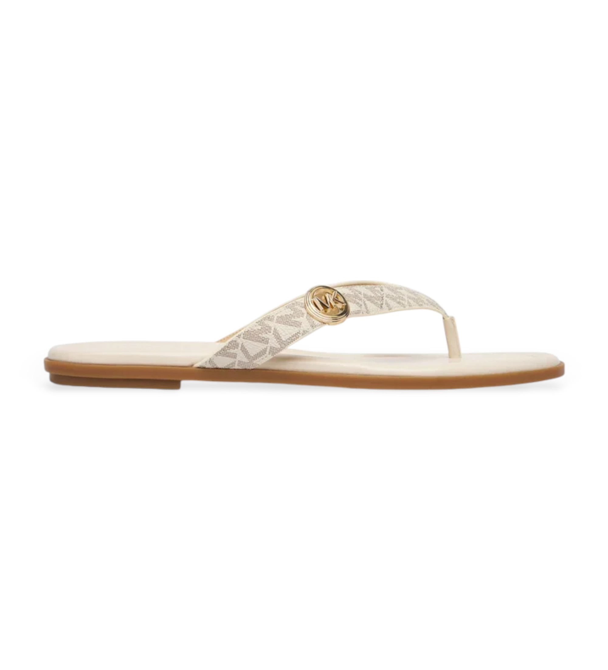 Sandały z płaskim noskiem Vanilla Michael Kors z płóciennym paskiem z monogramem i kultowym nadrukiem. Elegancki złoty medalion z logo MK na środku sprawia, że ten but jest natychmiast rozpoznawalnym dodatkiem, idealnym do podniesienia każdego letniego wyglądu z odrobiną dostępnego luksusu.