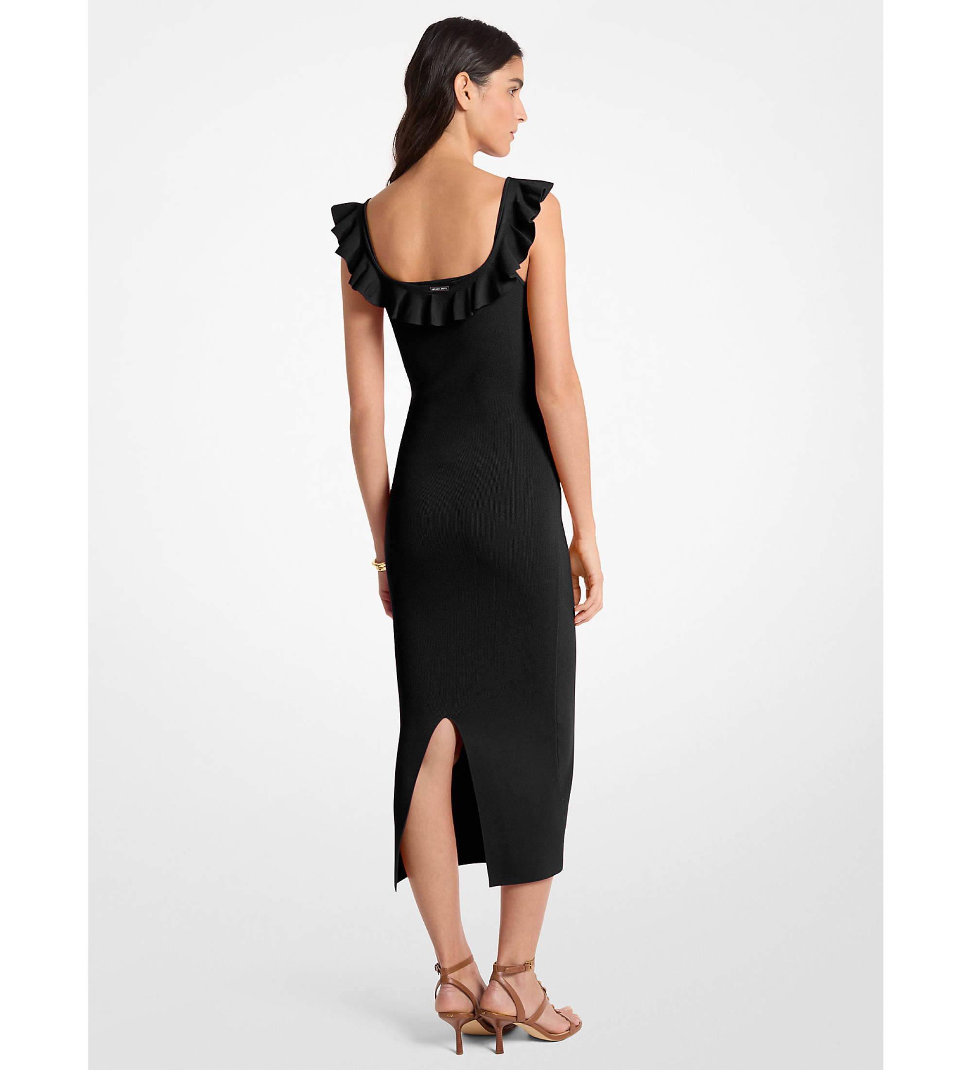 Zmysłowa, dopasowana sukienka z marszczonym kwadratowym dekoltem. Ta wersja jest wykonana z prążkowanej dzianiny z elastycznej, odpornej na zagniecenia wiskozy, dzięki czemu można ją wygodnie nosić przez cały dzień.