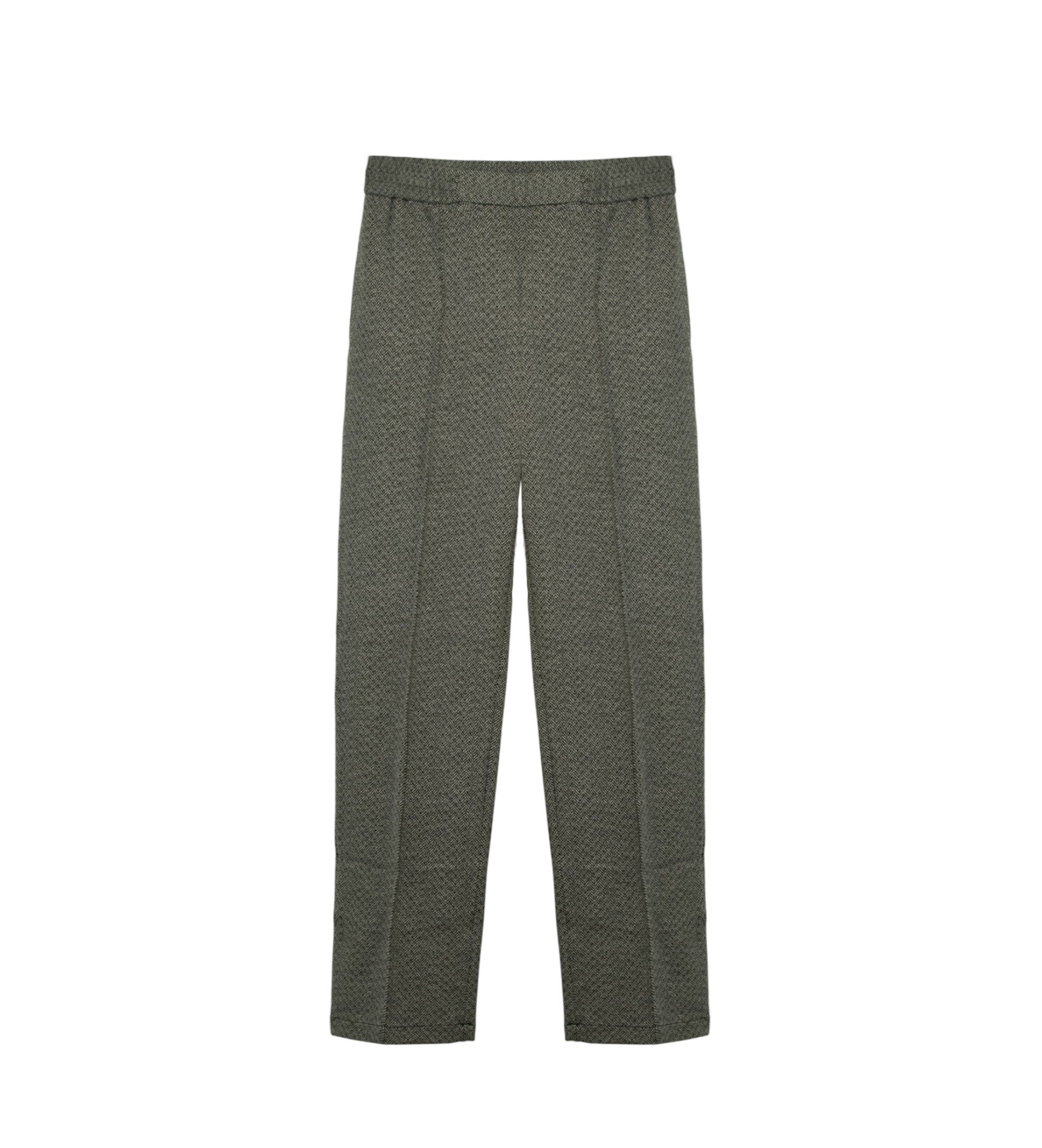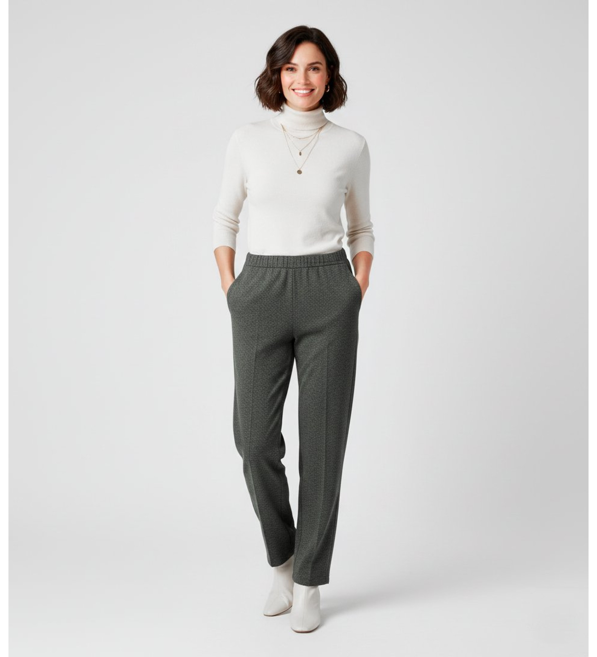 Niezbędne w miejskiej garderobie spodnie z dżerseju w prążki stanowią wygodny dodatek do dopasowanego stylu.
