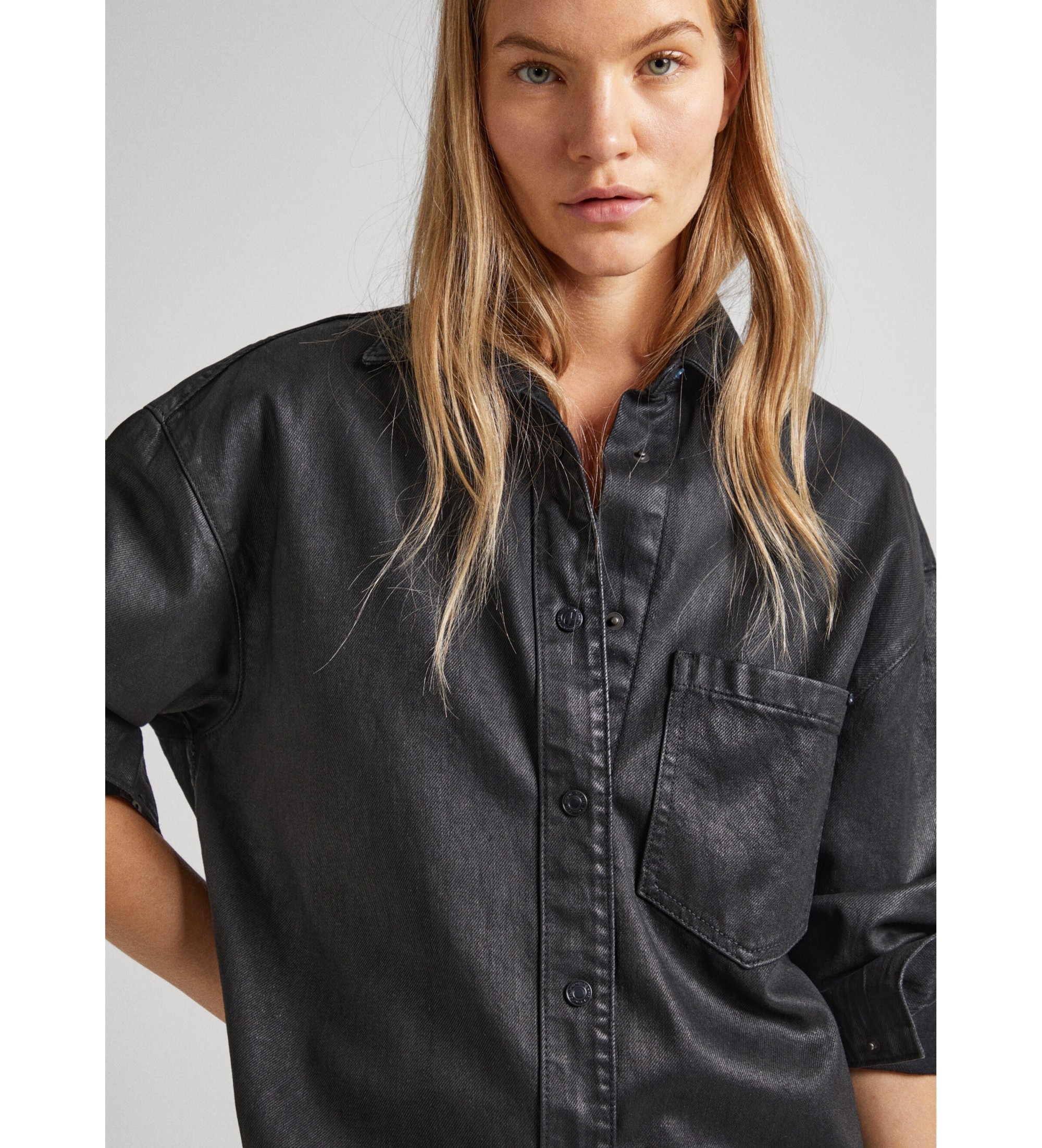 Aby zmniejszyć nasz wpływ na środowisko, ograniczamy zużycie wody, energii i szkodliwych chemikaliów oraz używamy odpowiedzialnych materiałów ze zrównoważonych źródeł. - Denimowa bluza oversize - Sztywny, czarny, powlekany materiał - Krój oversize - Długie rękawy - Klasyczny kołnierzyk - Zapięcie z przodu na zatrzaski - Czarny, lekki denim - Naszywane kieszenie na piersi - Plakietka z logo PEPEJEANS na przedniej kieszeni - Karczek z tyłu - Wykonana z wykorzystaniem zrównoważonych praktyk i materiałów.
