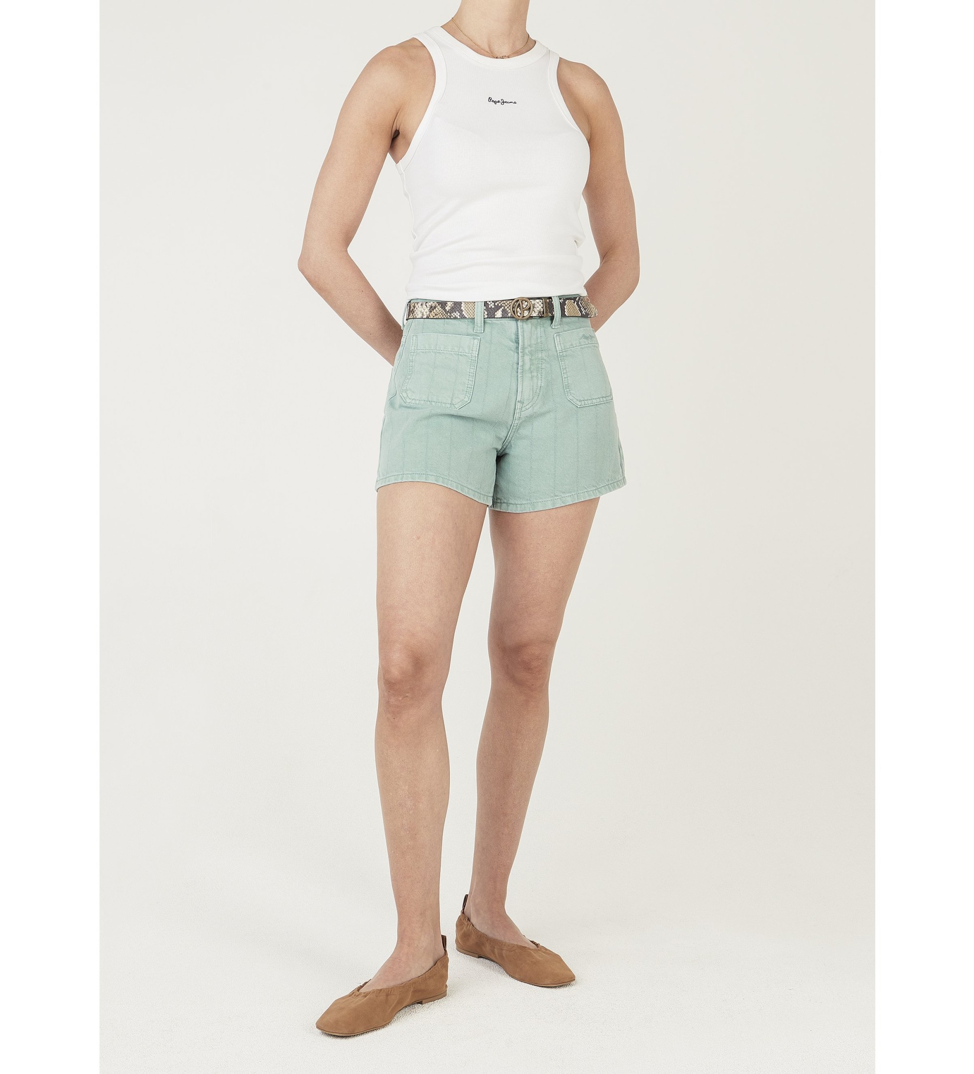 Odkryj te inspirowane latami 90. szorty o miękkiej linii A z naszywanymi kieszeniami z przodu. Wykonane z inspirowanego stylem vintage denimu w paski z barwieniem na odzieży, te szorty łączą nostalgię retro z autentyczną współczesną krawędzią. Luźny krój i charakterystyczne wykończenia sprawiają, że jest to wyjątkowy element z osobowością dla tych, którzy szukają oryginalnego i innego stylu.