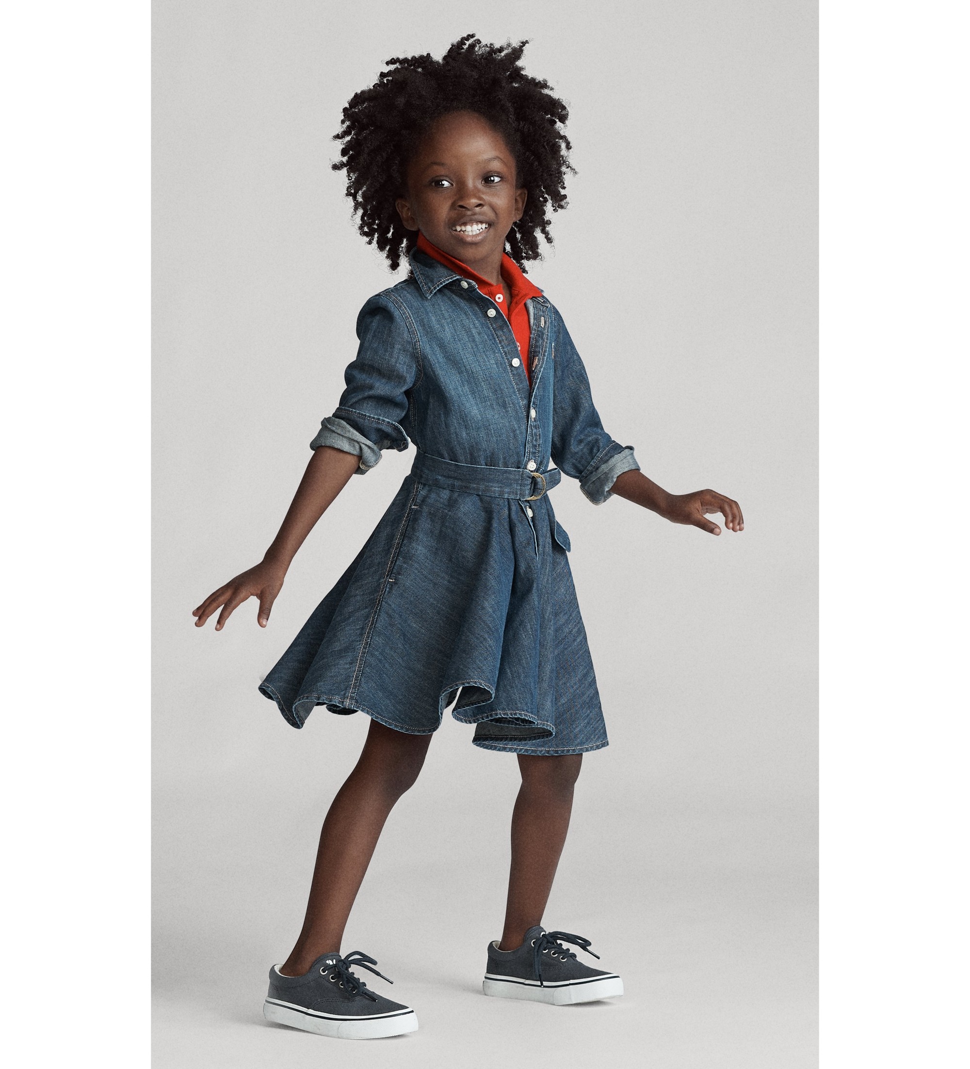 Dżinsowa sukienka w niebieskim kolorze, z paskiem i zapięciem na guziki w stylu koszuli.
