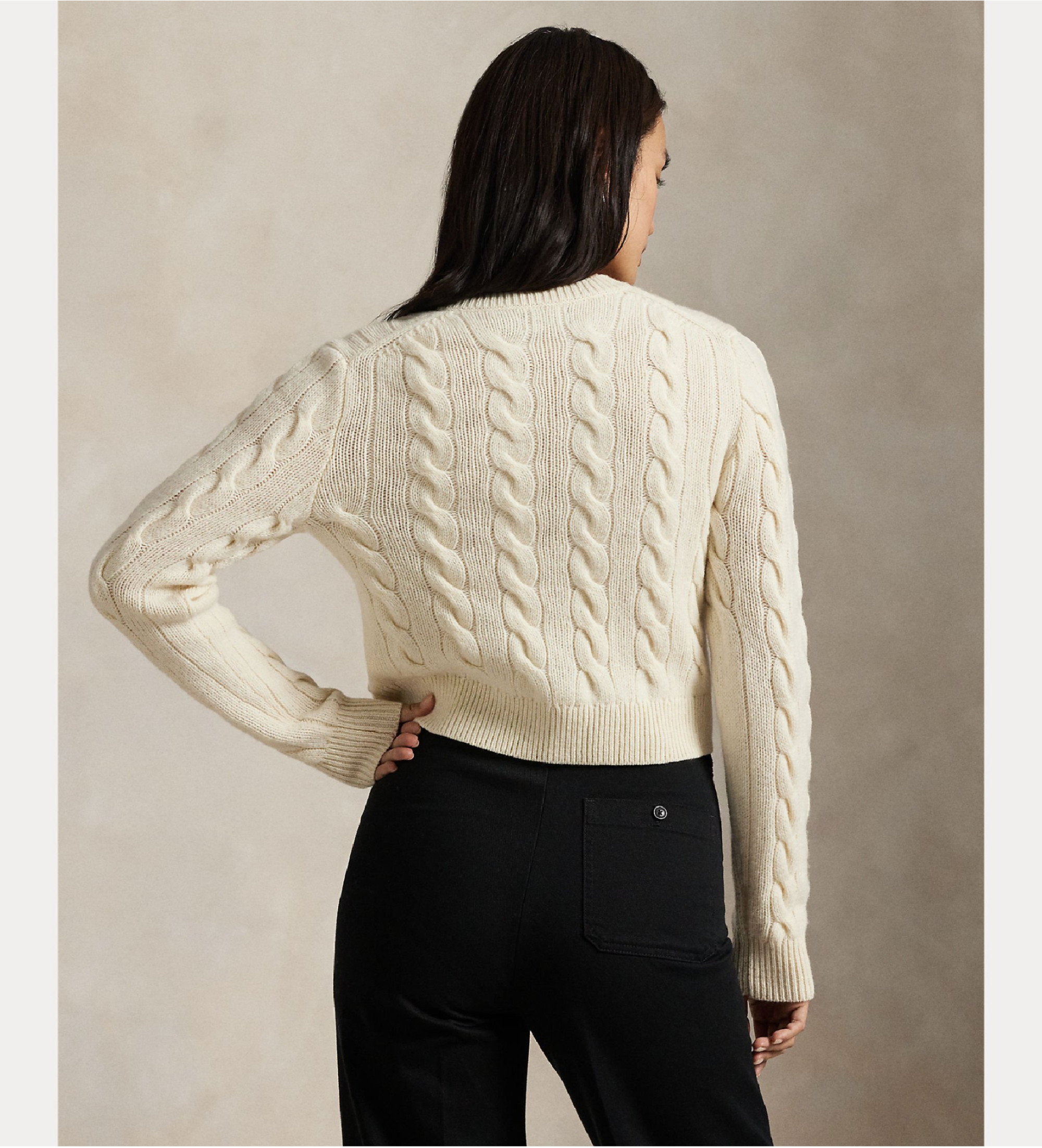 Dzianinowy kardigan z mieszanki wełny i kaszmiru ma przyciętą sylwetkę, kultowy motyw dzianiny kablowej i mosiężne guziki z wygrawerowanym hełmem dla charakterystycznego akcentu tego klasycznego elementu.