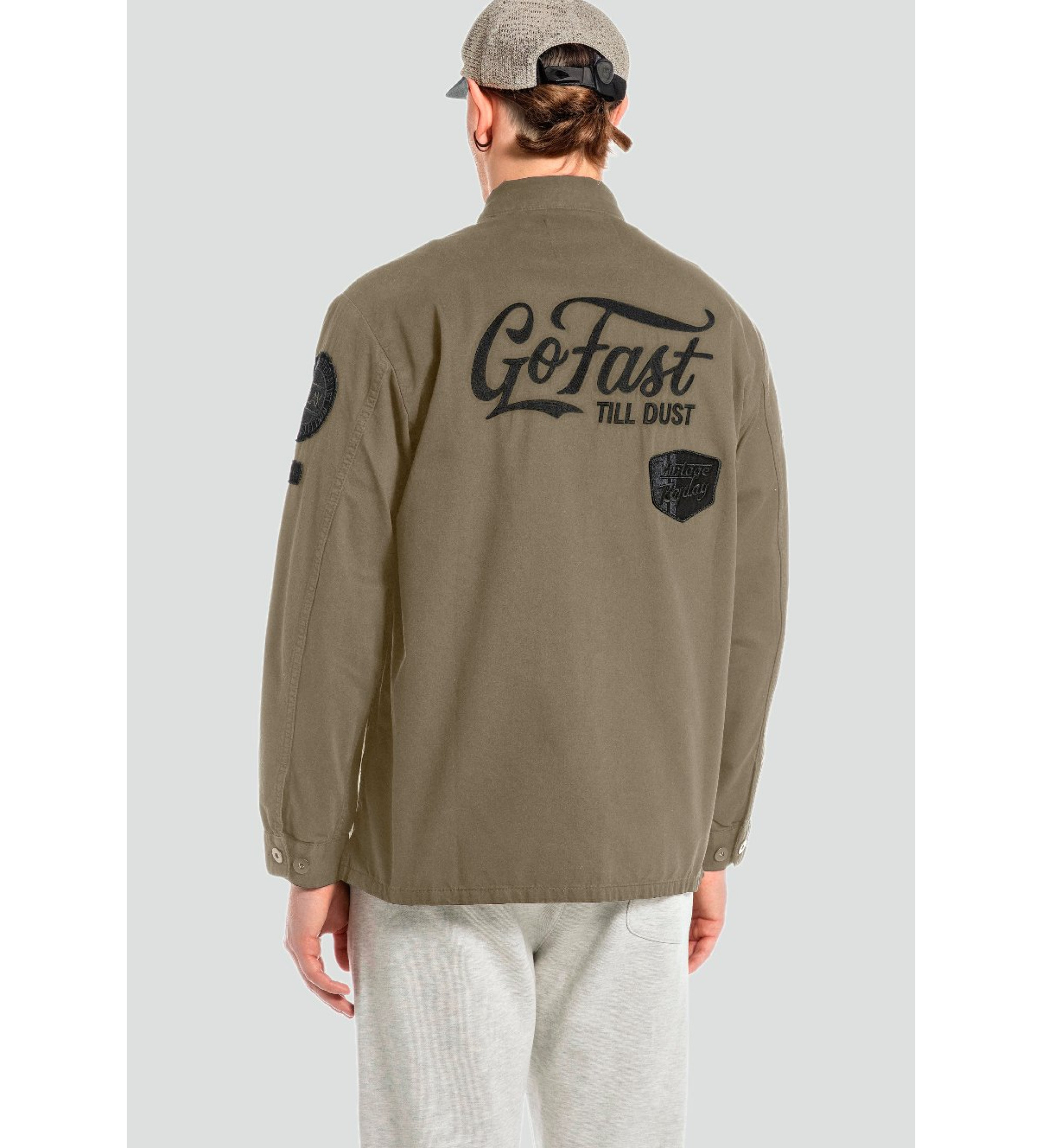 Marynarka koszulowa o regularnym kroju z gładkiego bawełnianego twillu. Model ten posiada klasyczny kołnierzyk w szpic, dwie przednie kieszenie z guzikiem i patką, mankiety zapinane na dwa guziki oraz zapięcie na guziki. Na przodzie, rękawach i plecach znajdują się liczne naszywki z haftowanymi napisami, a także duży haftowany napis na plecach.