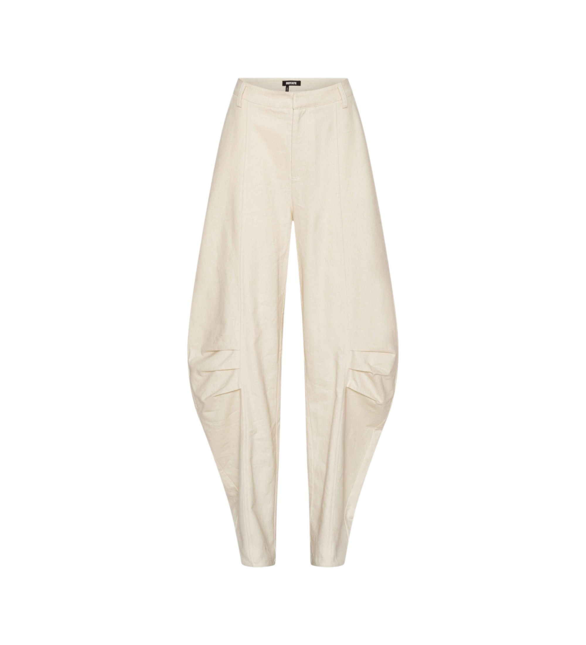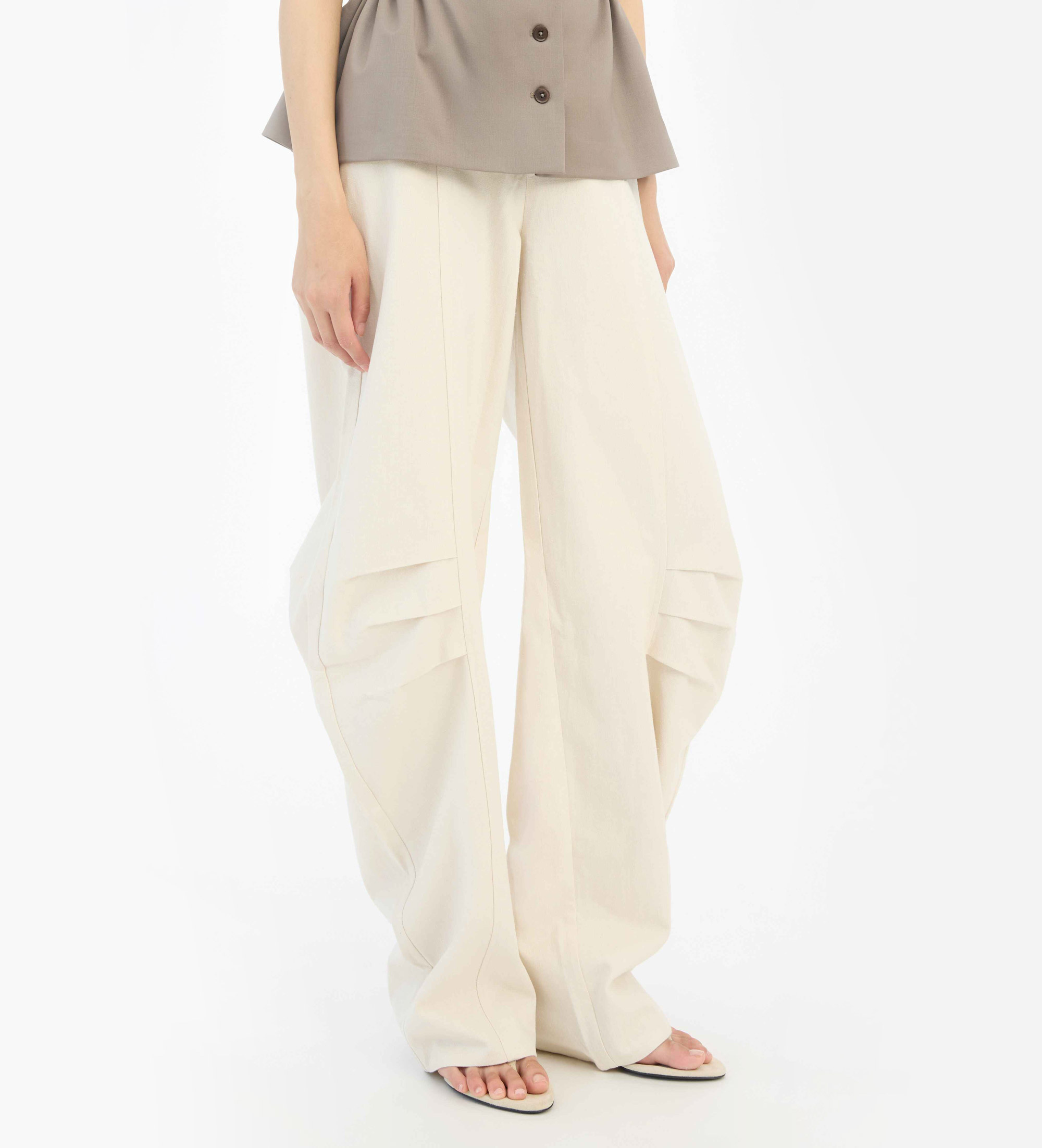 Kremowe lniane spodnie w jasnym kolorze, z prostym pasem i szlufkami na pasek. Mają proste nogawki z widocznymi zakładkami na kolanach, które wysmuklają sylwetkę. Mają widoczne kieszenie z przodu i naszywane kieszenie z tyłu. Tkanina ma lekką fakturę wskazującą na mieszankę lnu. Spodnie mają podszewkę.