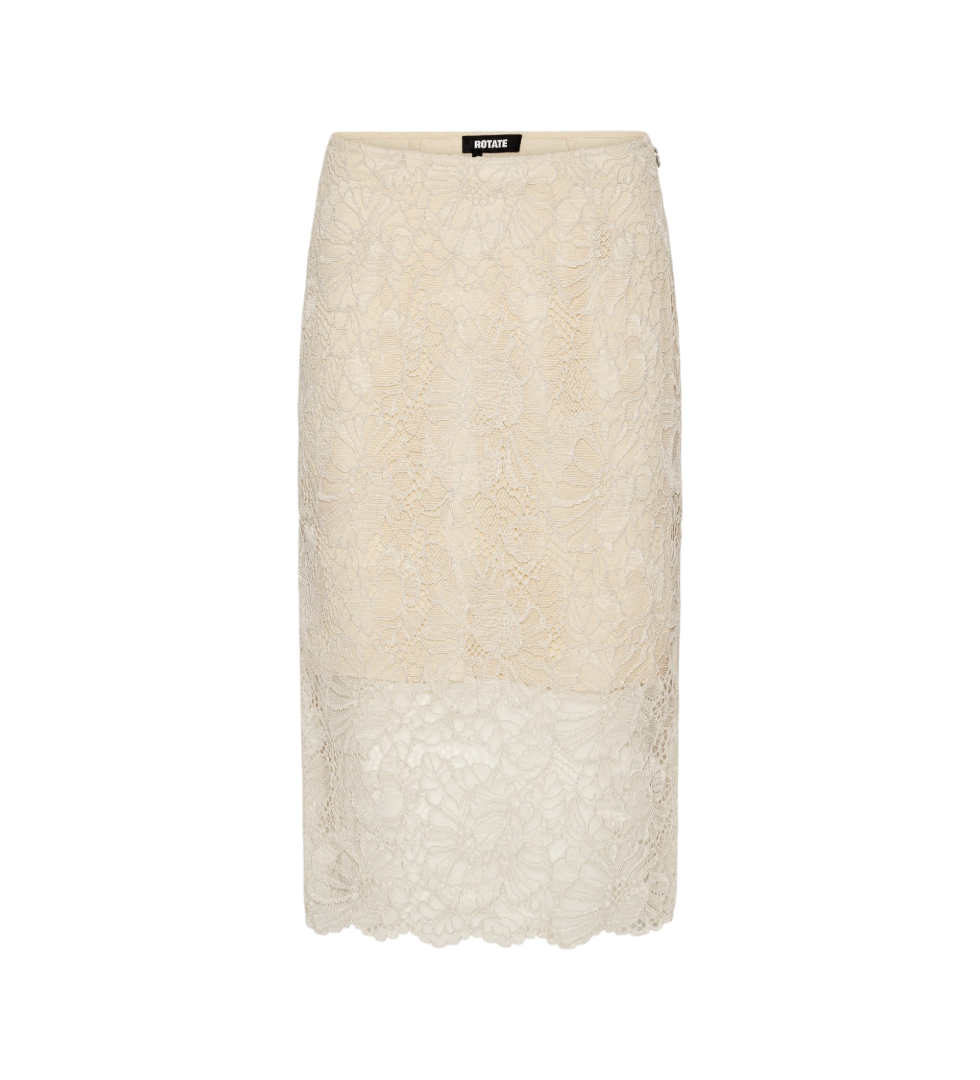 Cream Lace Midi Pencil Skirt to spódnica midi o dopasowanym kroju. Jest wykonana z koronki z kwiatowym nadrukiem na całej powierzchni i ma prosty krój. Ma gładki pasek i boczne zapięcie na suwak. Posiada podszewkę.