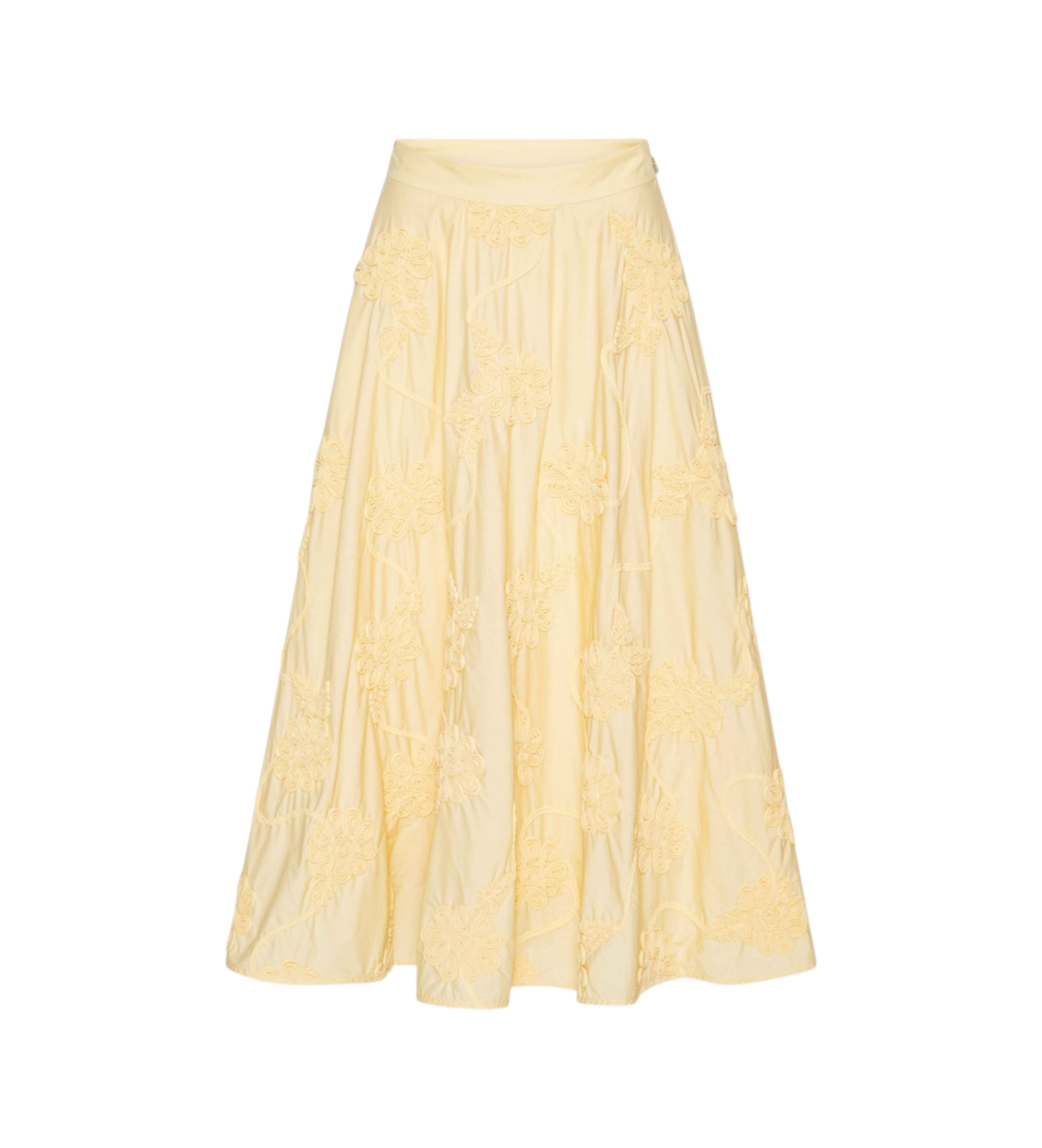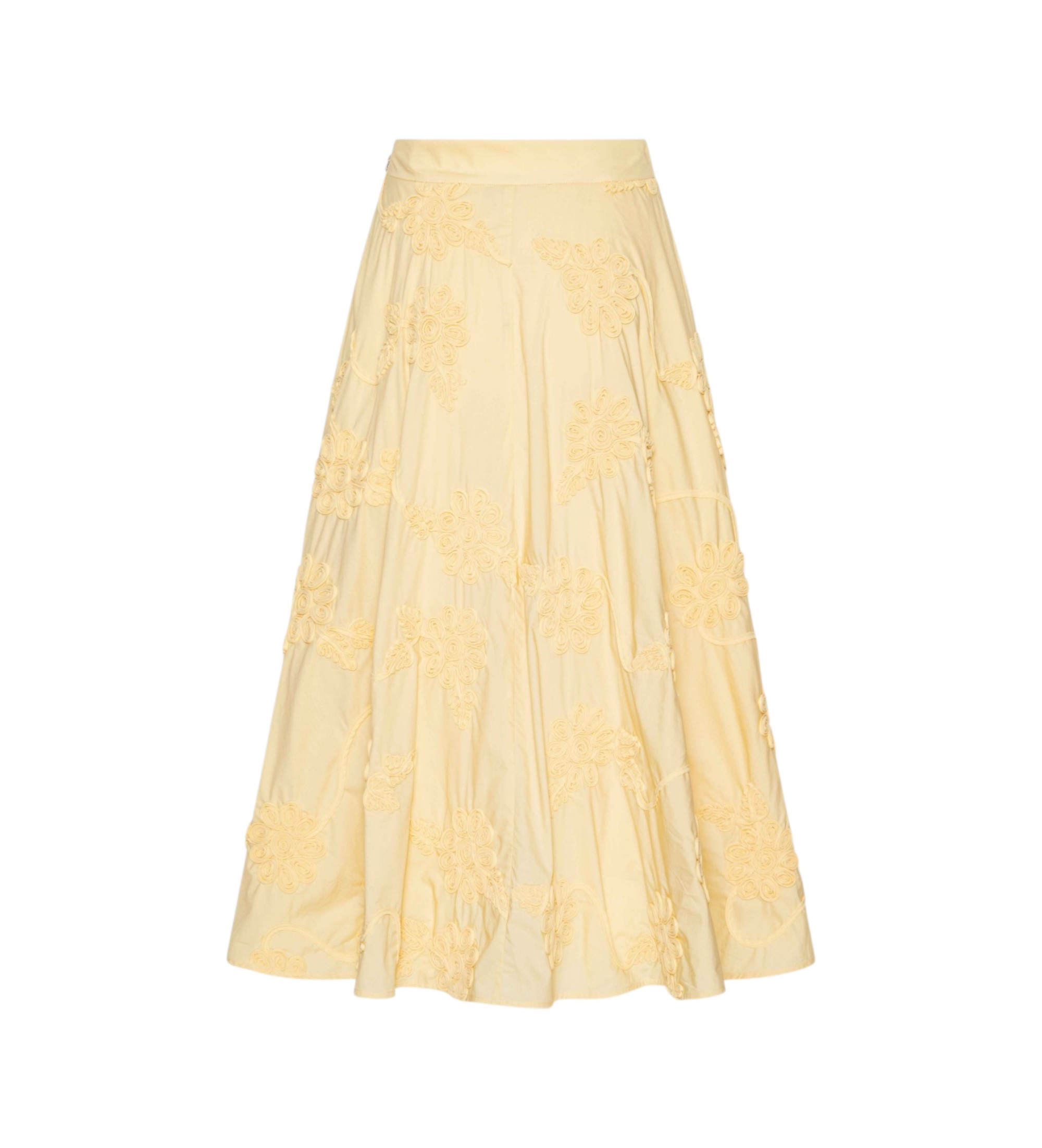 Spódnica maxi w żółte kwiaty to długa, lejąca spódnica z wysoką talią i miękką, obszerną sylwetką. Jest ozdobiona kwiatowymi aplikacjami ton w ton, które nadają jej teksturę i dekoracyjne wykończenie. Posiada gładki pas i zapięcie na zamek błyskawiczny z tyłu. Wykonana z bawełny organicznej z poliestrowymi kwiatowymi detalami i podszewką.