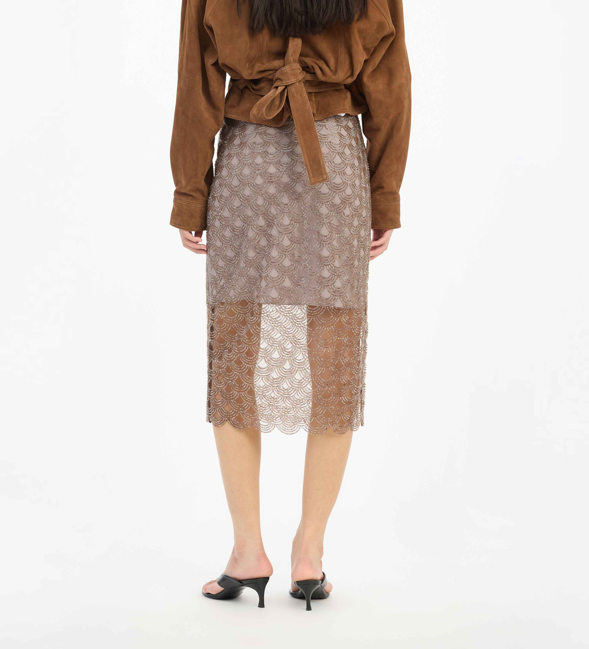 Taupe Scalloped Sequin Midi Skirt to spódnica midi zaprojektowana w kolorze taupe z marszczonym cekinowym nadrukiem. Sylwetka sięga do połowy łydki i ma prosty krój z lekkim, płynnym drapowaniem. Zapiekany dół nadaje jej dekoracyjne wykończenie, a półprzezroczysta warstwa cekinów tworzy kontrastową teksturę i połysk. Spódnica ma podszewkę, która zapewnia okrycie i podkreśla cekinowy nadruk.