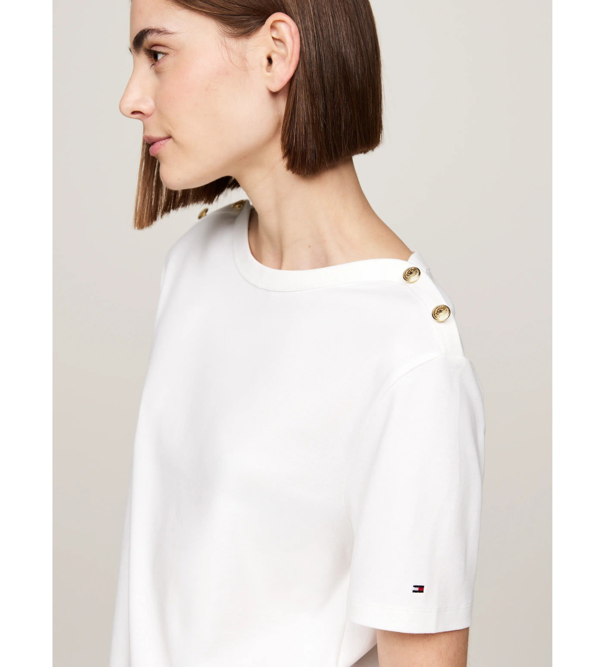 Ta koszulka ma złote guziki z wytłoczonym herbem TH na ramionach, co nadaje jej stylowy morski akcent.