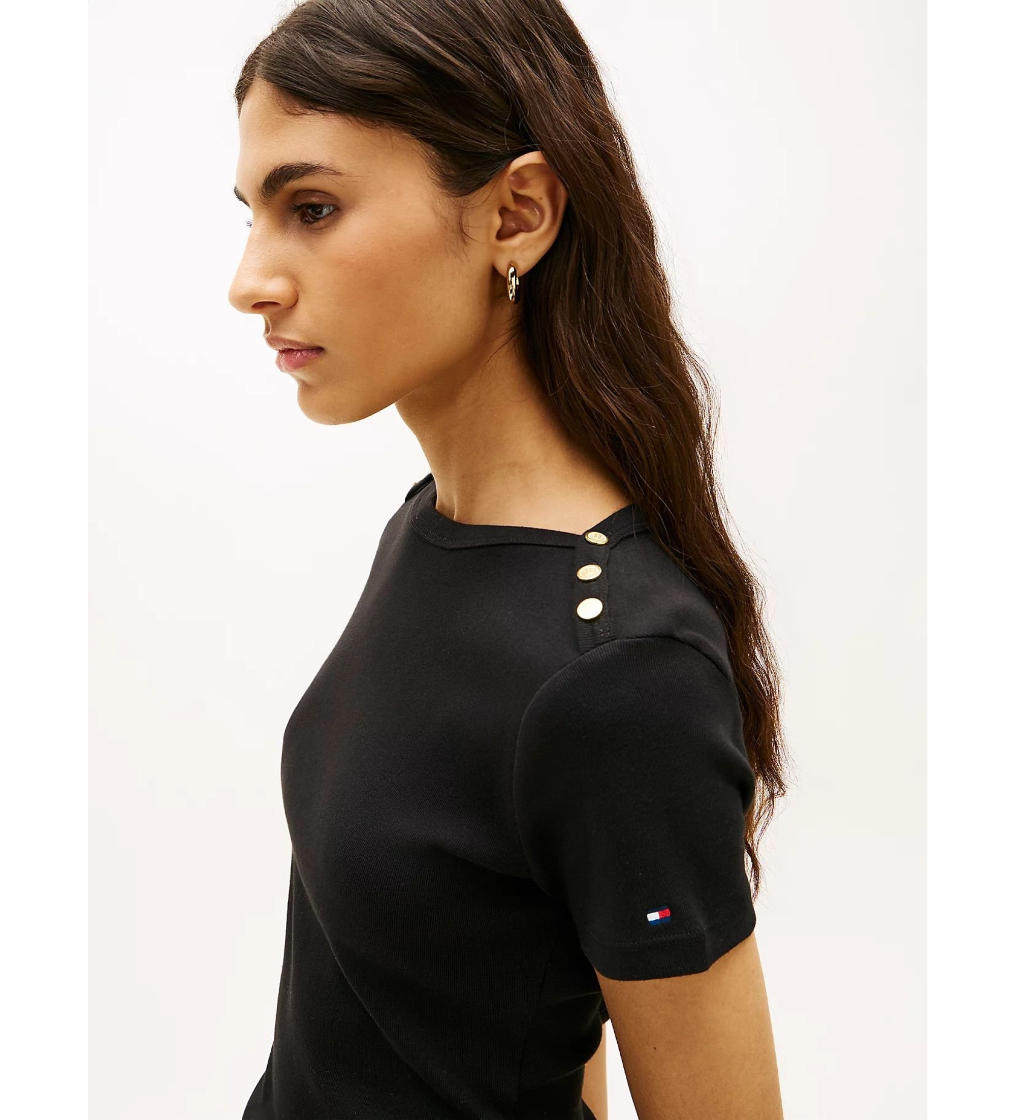 Tommy Hilfiger Wąska koszulka z dekoltem w łódkę i guzikami, czarna