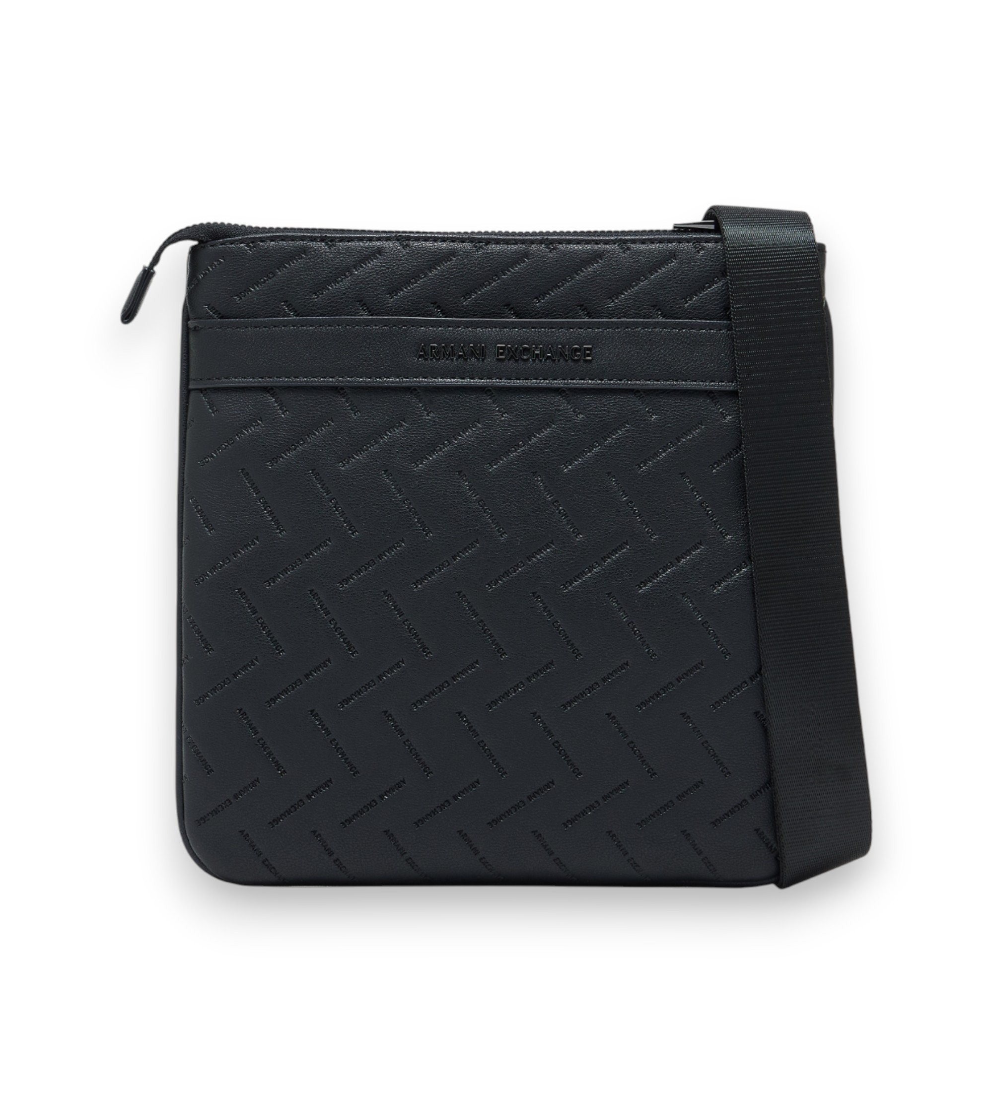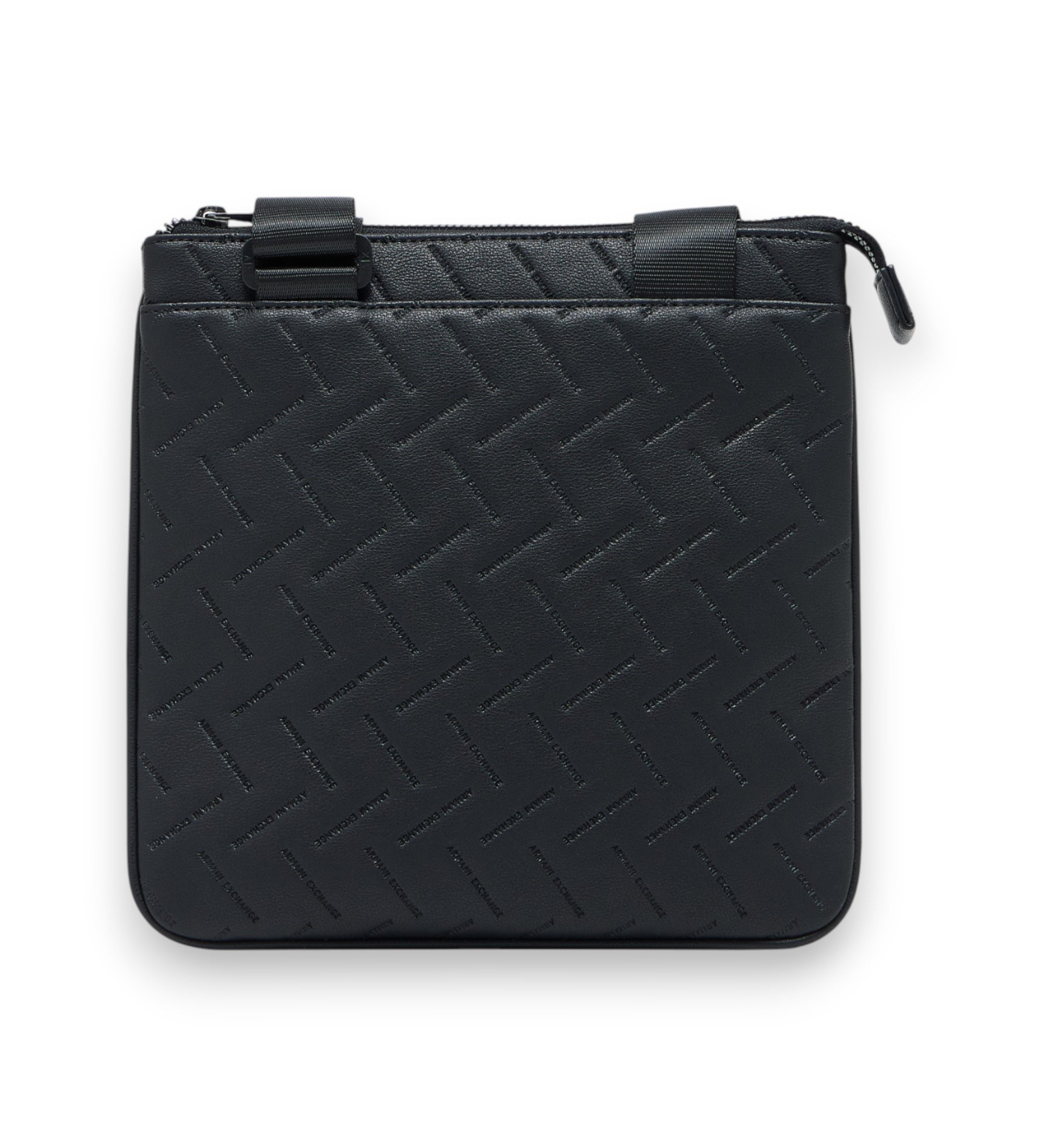 Mala de ombro com padrão de texto da marca na diagonal e risca horizontal com o nome da marca como elemento principal. Um acessório moderno e reconhecível que combina um design simples e sofisticado com pormenores distintivos da marca para um visual moderno e contemporâneo.