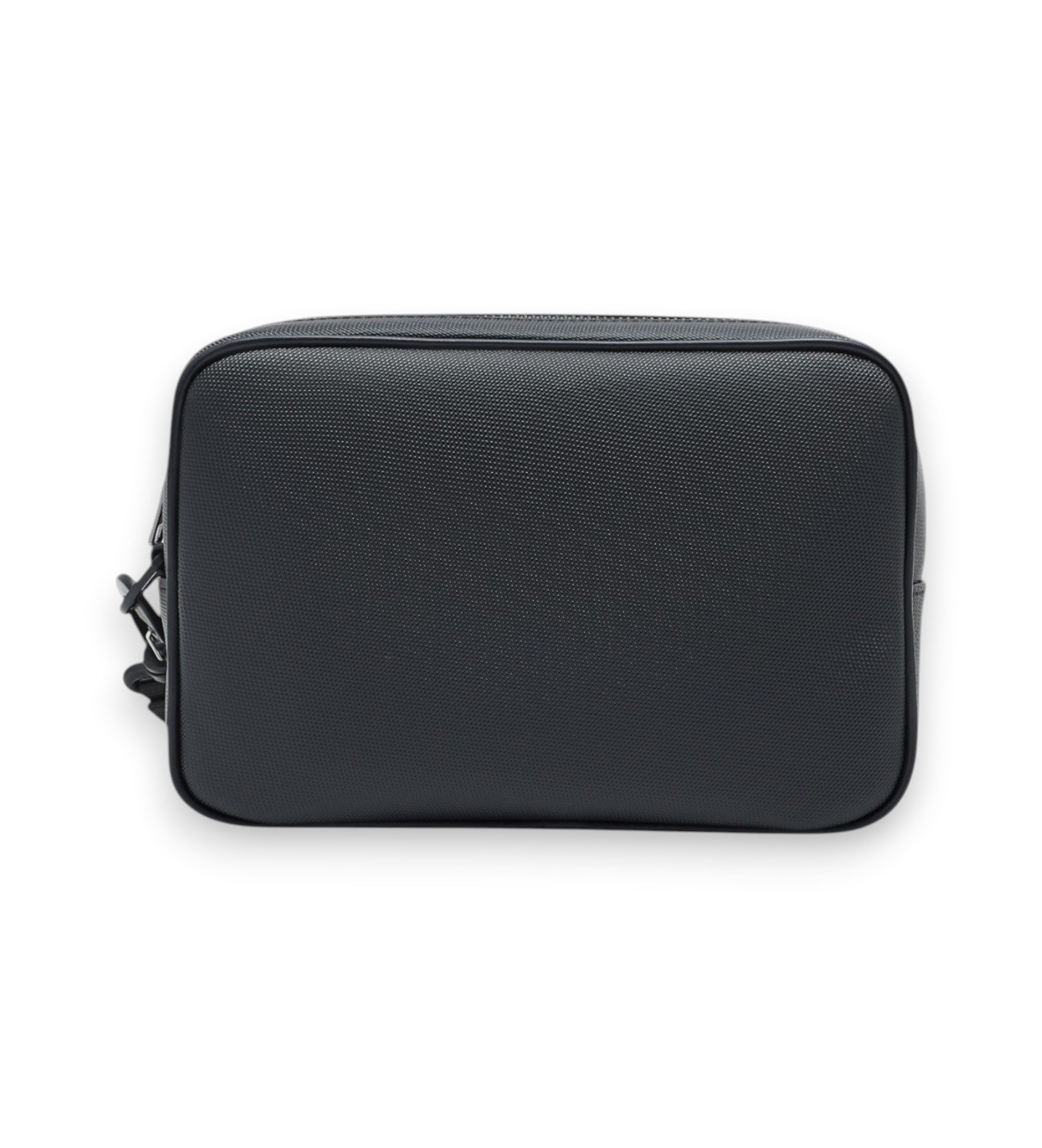 Clutch para homem em material resistente (100% poliéster) em preto com detalhes em metal e acabamento brilhante. Apresenta o logótipo em relevo na parte da frente, fecho de correr e uma alça de pulso amovível que permite transportá-la como saco de toilette ou clutch. Design compacto e funcional concebido para complementar os looks contemporâneos; cor predominante preta e material principal poliéster.